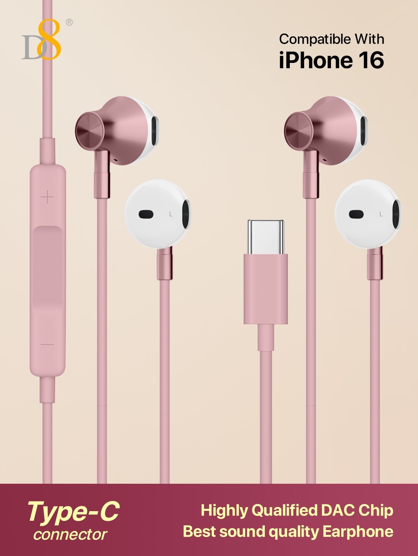 The D8 2PCS Type C In-Ear Earphones are designed for high-quality sound and convenience, providing an exceptional audio experience for all your devices. Featuring built-in microphones and volume control, these earbuds are compatible with a wide range of devices including the latest iPhone 16 Pro/Max, iPad Pro, iPad Air, and Samsung Galaxy S23/S22/S21 Ultra. Whether you're listening to music, making calls, or watching videos, these earphones offer crystal-clear audio with easy controls at your fingertips.