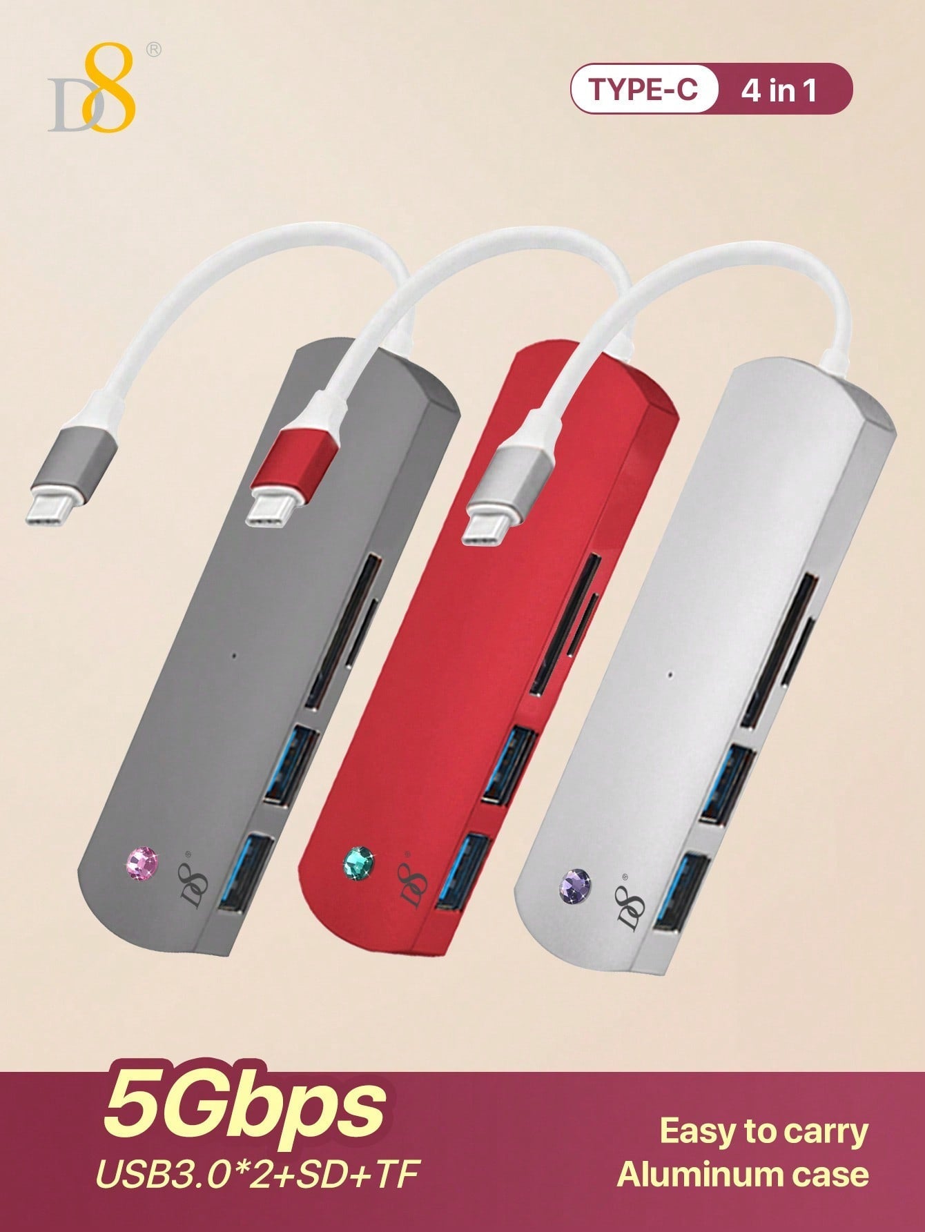 D8 4 In 1 USB C Hub Multiport Adapter With USB-C And 2 USB A 3.0 5Gbps, SD/TF Card Reader, Aluminum USB C To USB Hub For I Phone 16/15 Series, Pro 2021/2019/2018,Chromebook Pixel Matebook Ulti USB Port Hub For Windows, Ipad Pro, Chromebook