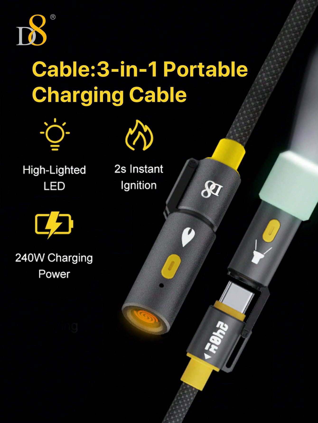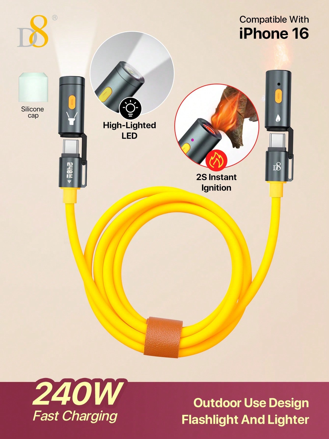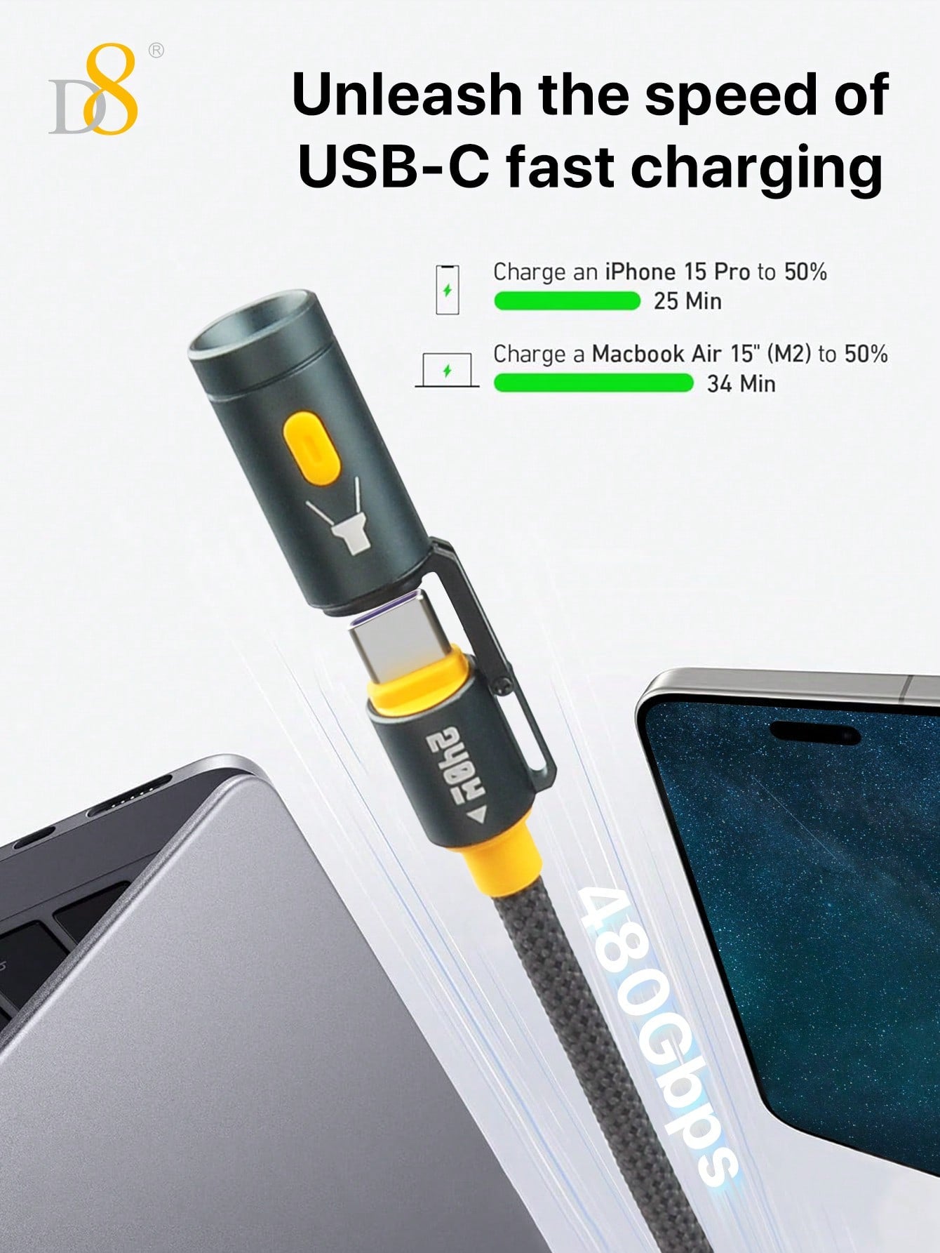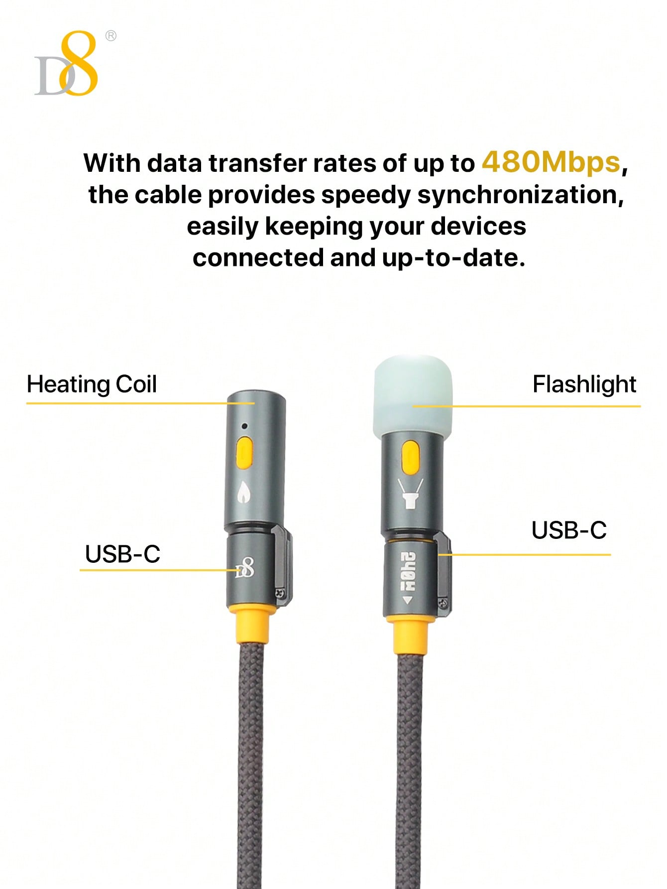 The D8 All-In-1 Portable Charging Cable is the ultimate solution for fast charging and multi-functional use. With a powerful 240W high power output, this USB C to USB C cable is designed to charge your devices quickly and efficiently, while offering additional features such as bright LED lighting and a precision heating element. Whether you're at home, in the office, or traveling, this cable ensures your devices stay powered and your work is never interrupted. Perfect for tech enthusiasts and professionals who need reliable performance and added functionality.