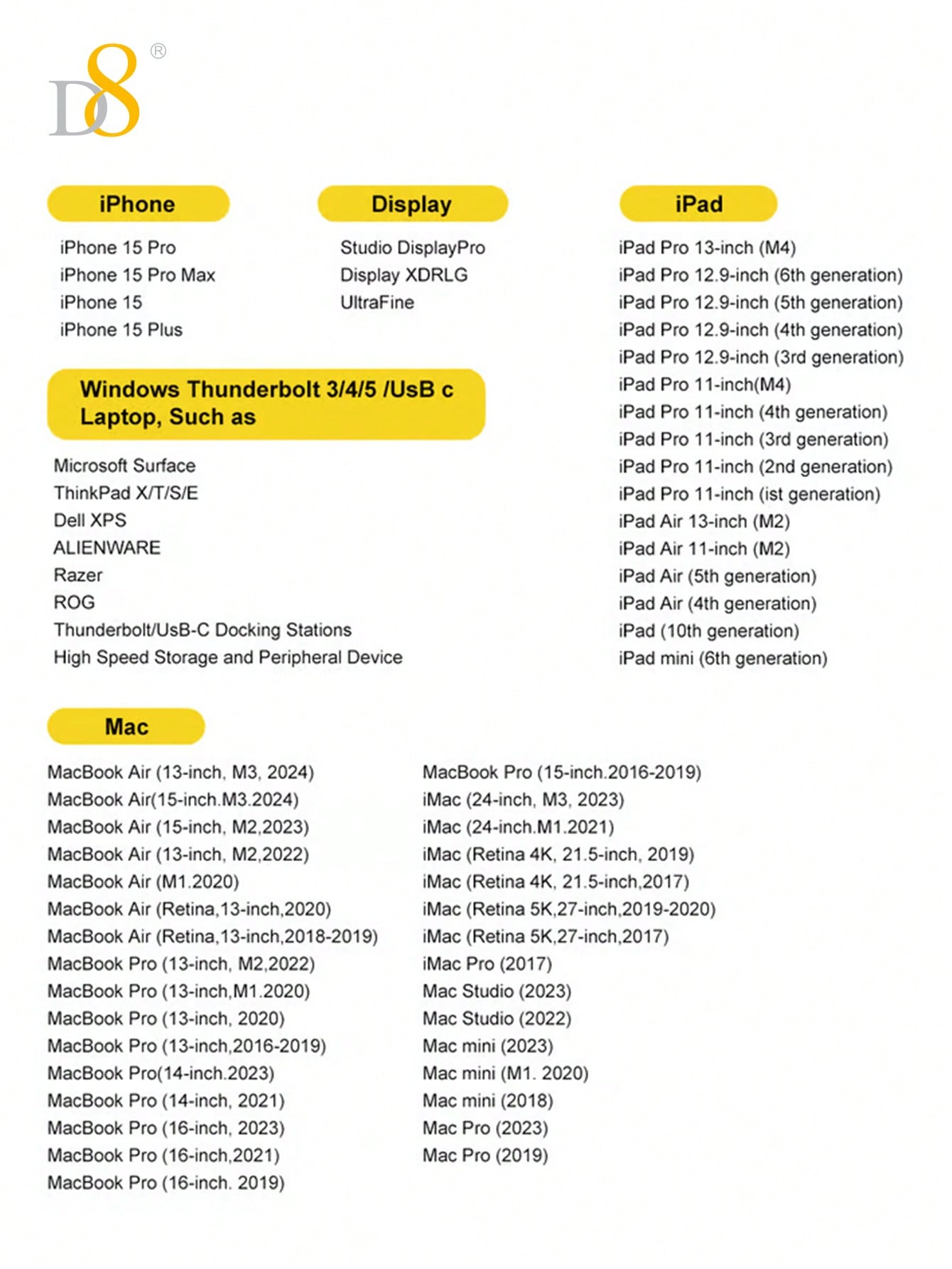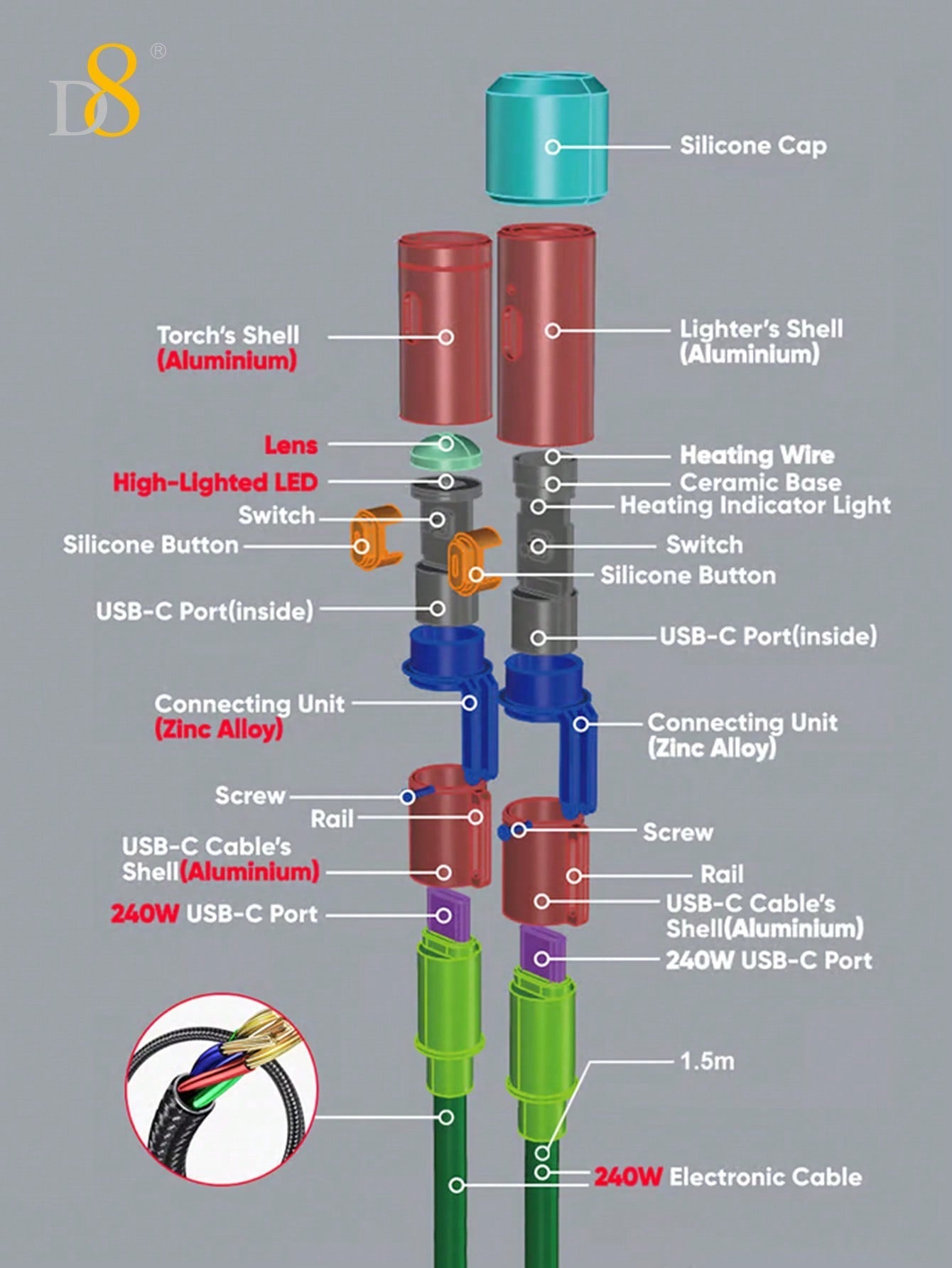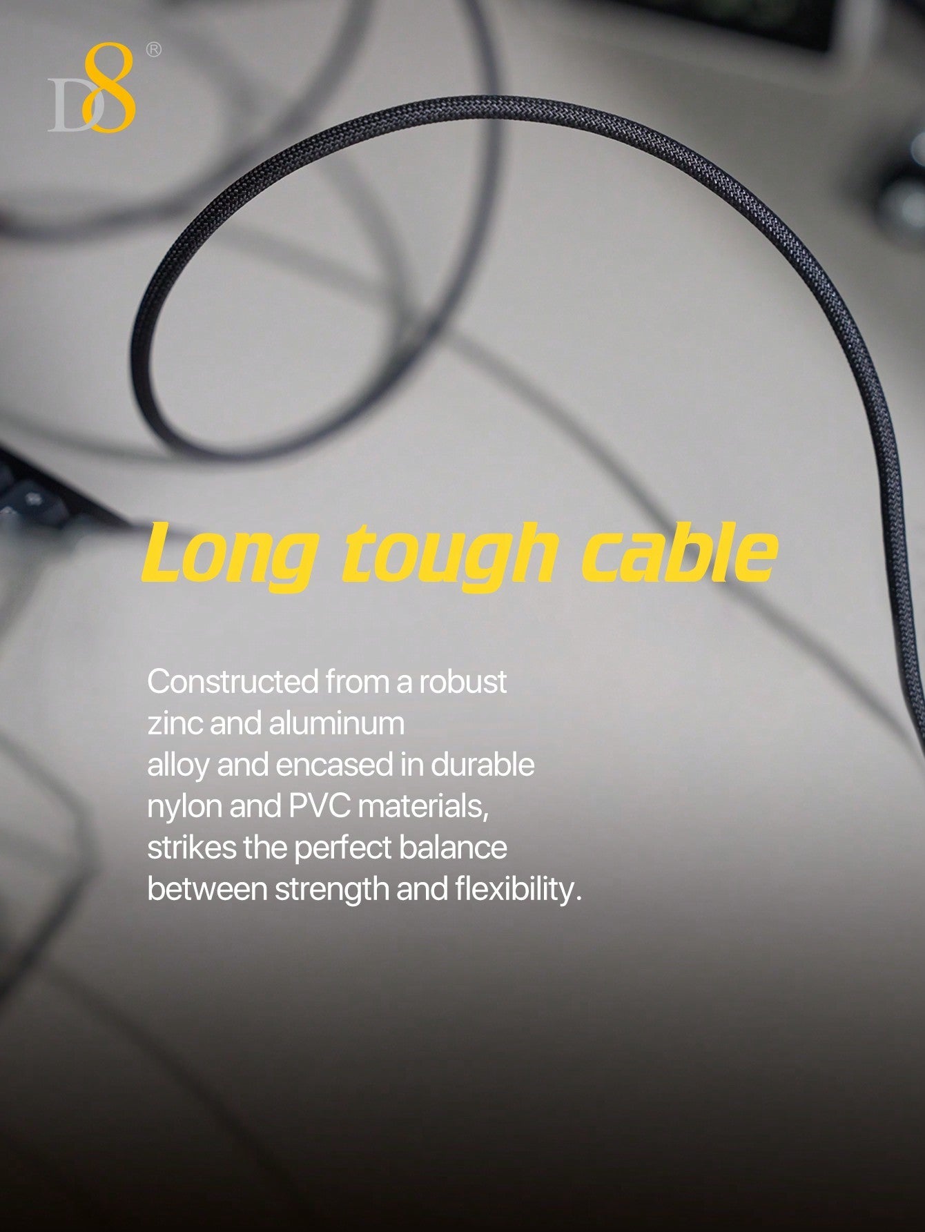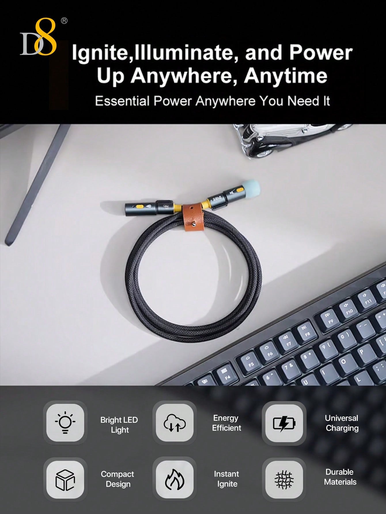 The D8 All-In-1 Portable Charging Cable is the ultimate solution for fast charging and multi-functional use. With a powerful 240W high power output, this USB C to USB C cable is designed to charge your devices quickly and efficiently, while offering additional features such as bright LED lighting and a precision heating element. Whether you're at home, in the office, or traveling, this cable ensures your devices stay powered and your work is never interrupted. Perfect for tech enthusiasts and professionals who need reliable performance and added functionality.