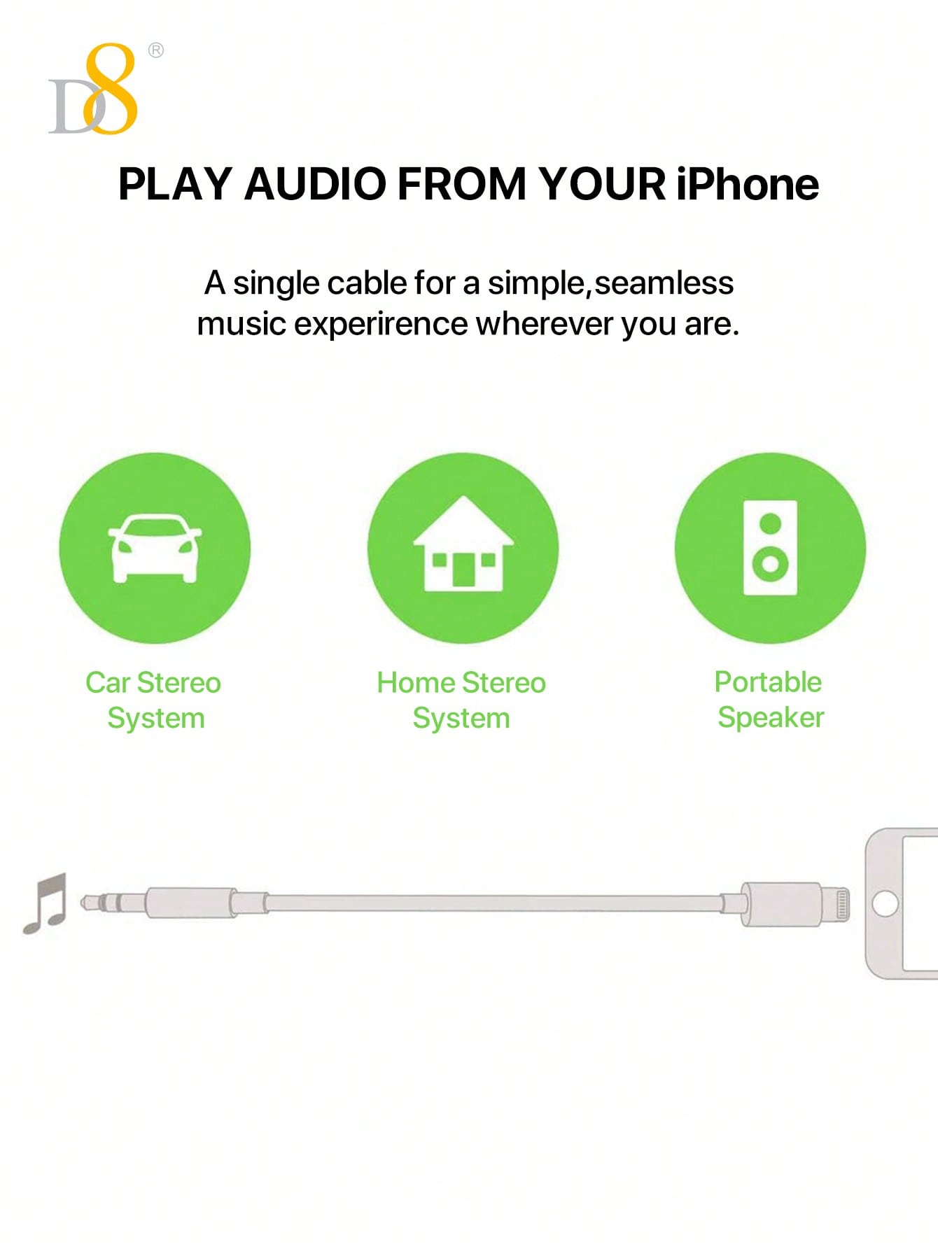 The D8 iPhone AUX Cord is a must-have for anyone who wants reliable and high-quality audio performance from their iPhone. Its 3.3ft length, robust build, and easy plug-and-play functionality make it the ideal solution for connecting your iPhone to headphones, car stereos, or external speakers. Whether you're using it for personal listening or in the car, it offers seamless compatibility and excellent sound quality.