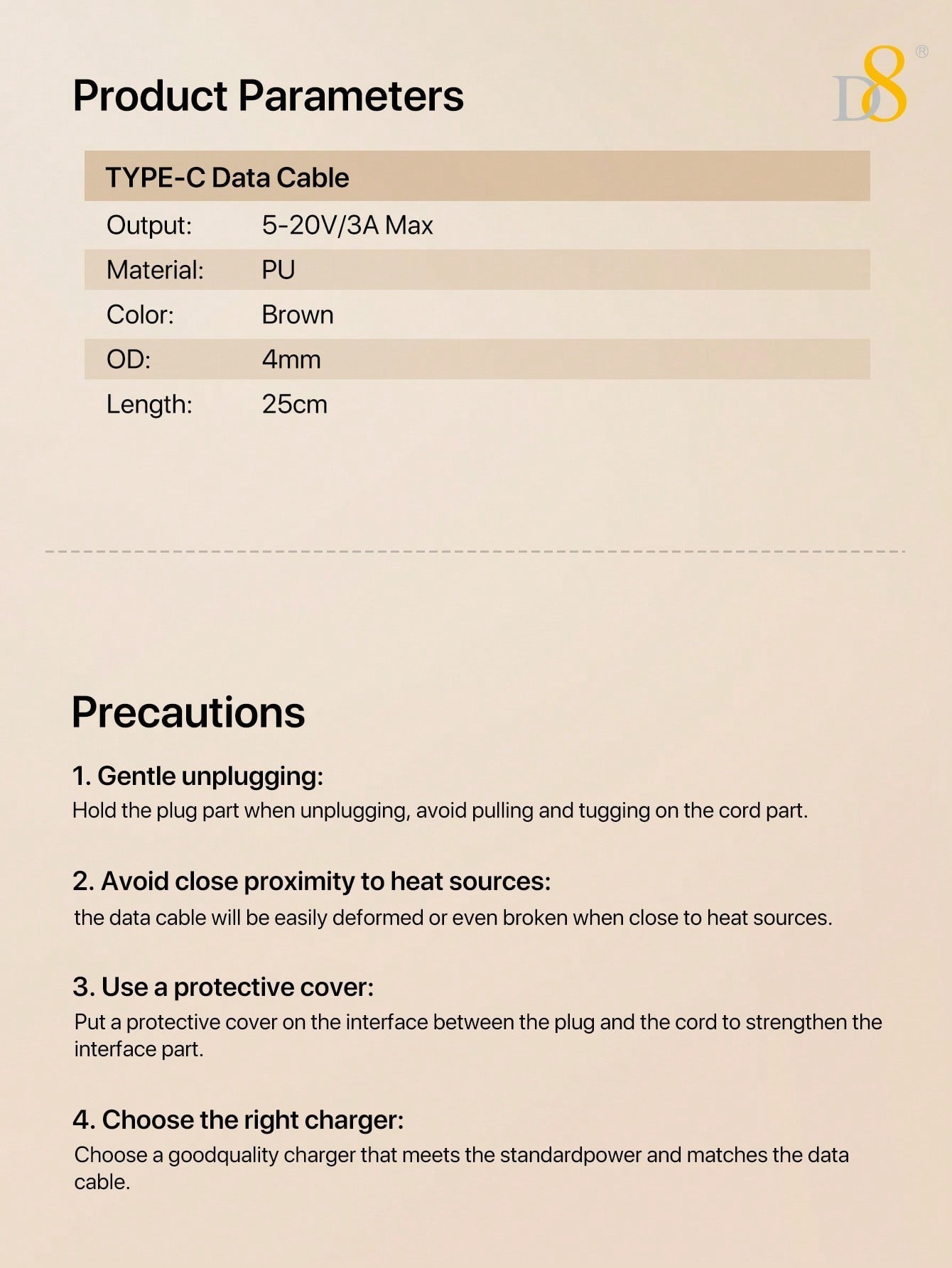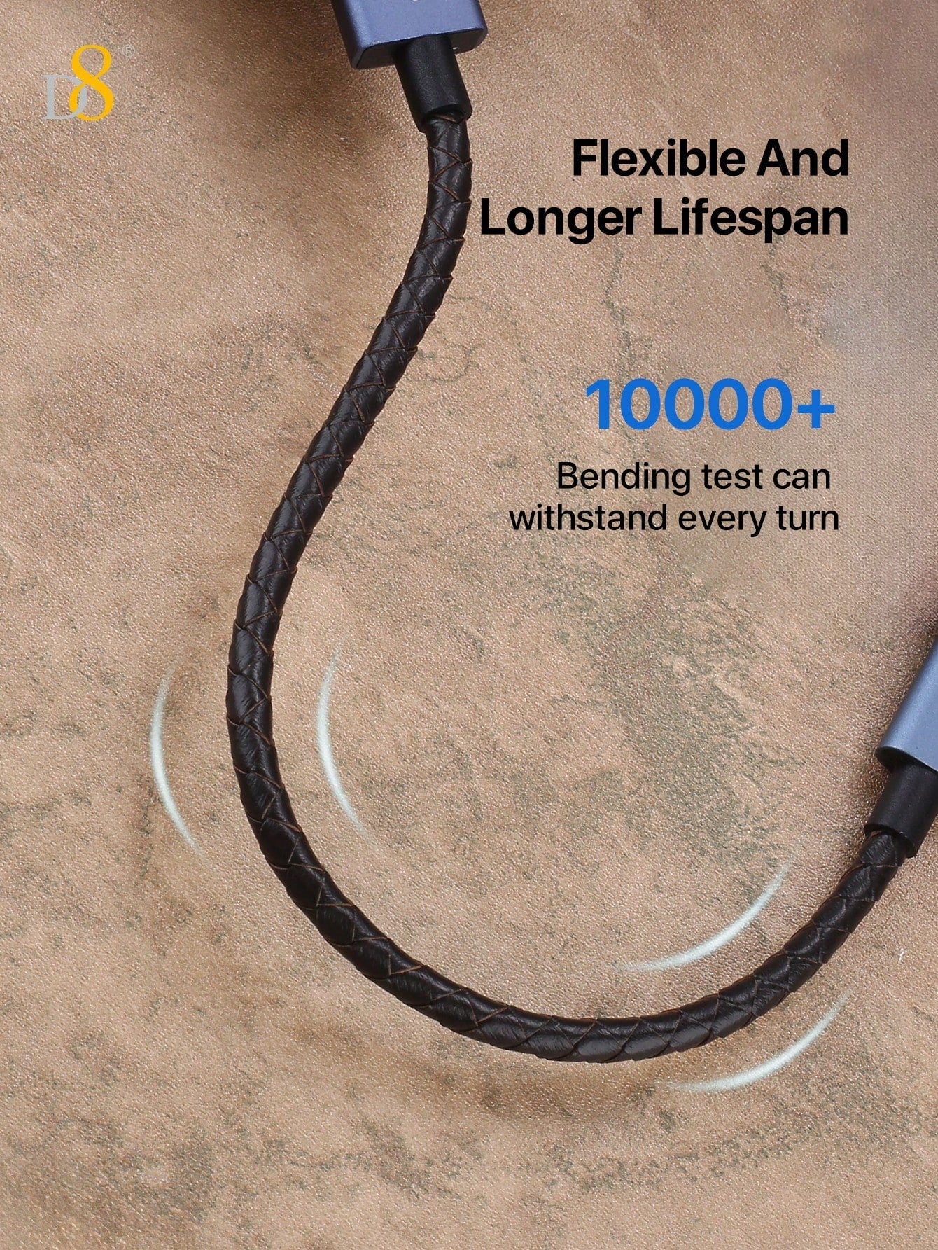 The D8 Genuine Leather Type-C Charging Cable brings performance and style together in a sleek, short design. Whether you're traveling, commuting, or simply want a neater desktop charging solution, this high-speed cable delivers reliable power while making a bold statement. Built for those who value functionality and elegance, it’s the ideal accessory for modern tech users.