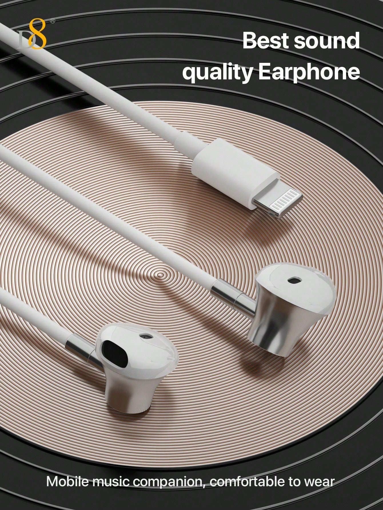 The D8 Lightning Connector Headphones are the ultimate wired earbuds for iPhone users, providing crystal-clear sound and exceptional convenience. Featuring an integrated microphone and built-in remote control, these MFi Certified headphones allow you to easily control your music, phone calls, and volume. With noise isolation capabilities, these headphones ensure a premium listening experience, blocking out distractions. Whether you're on a call, enjoying your favorite music, or focusing on work, these headphones deliver unparalleled sound and functionality for your iPhone and Apple devices.