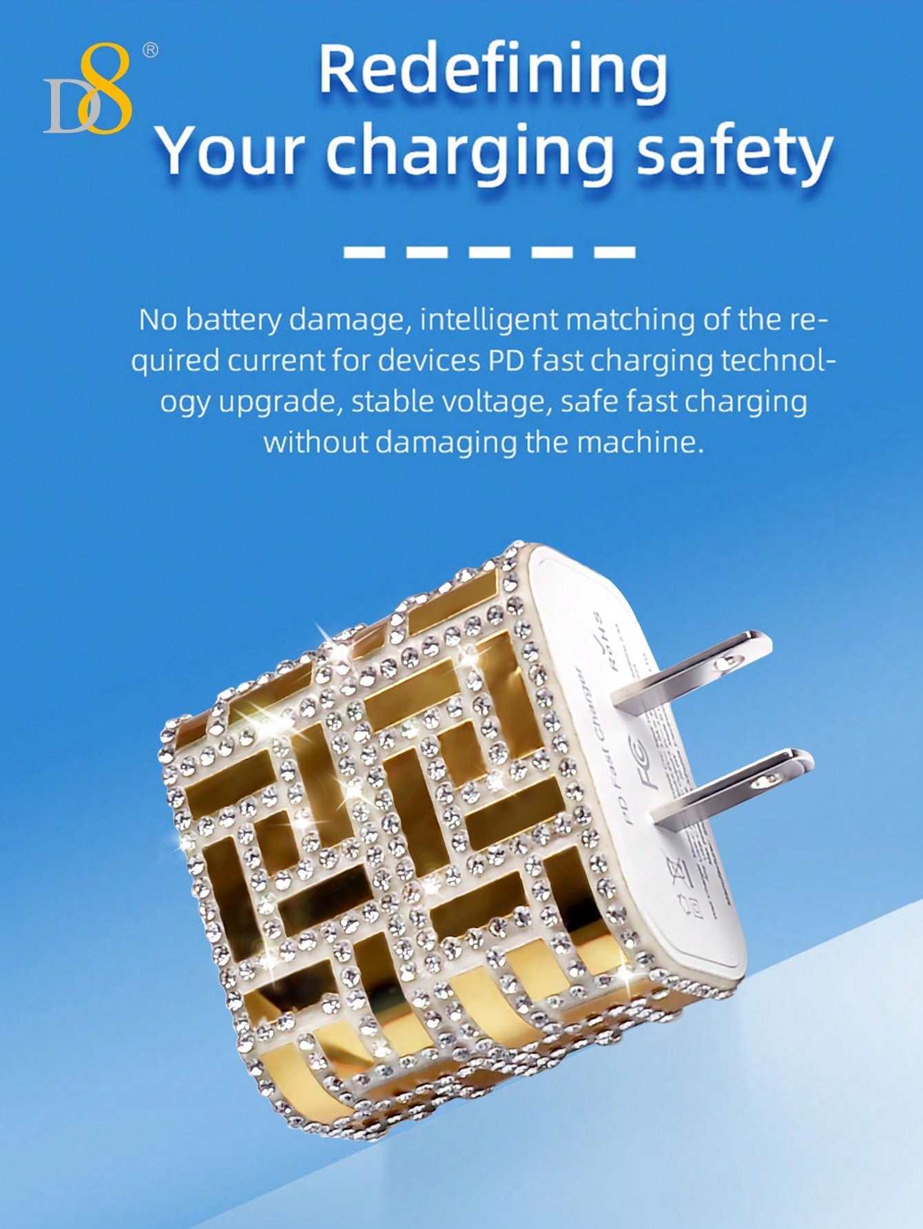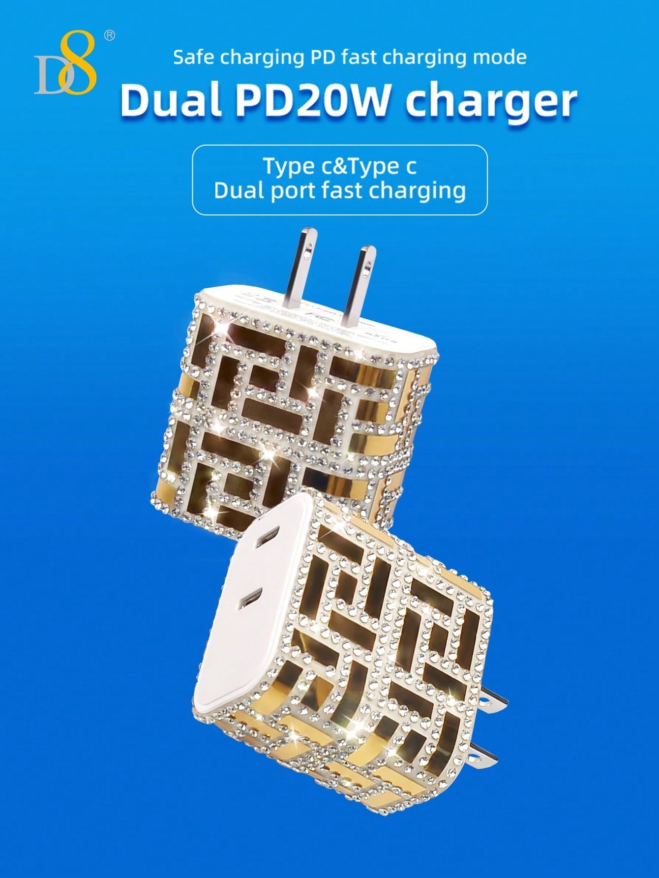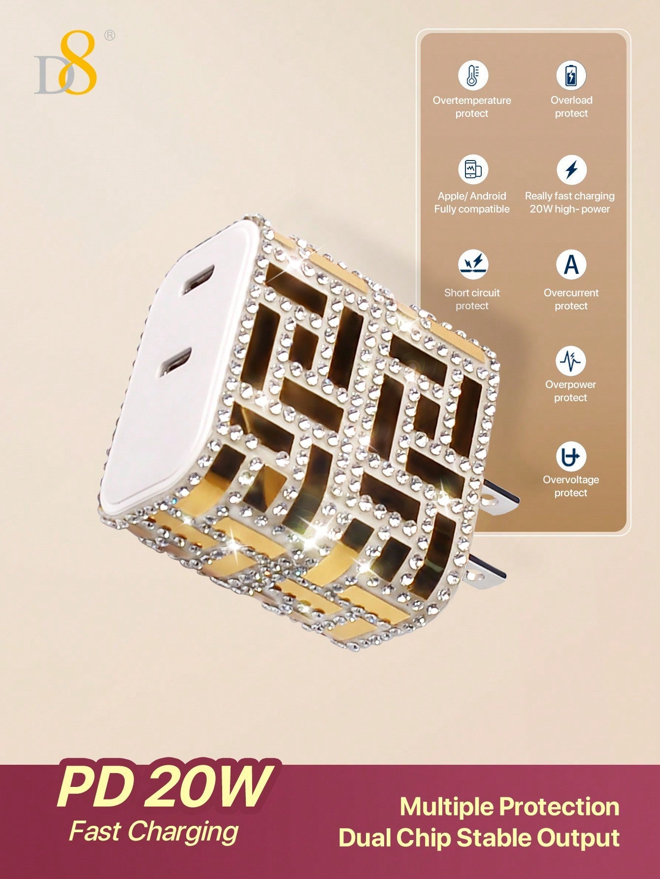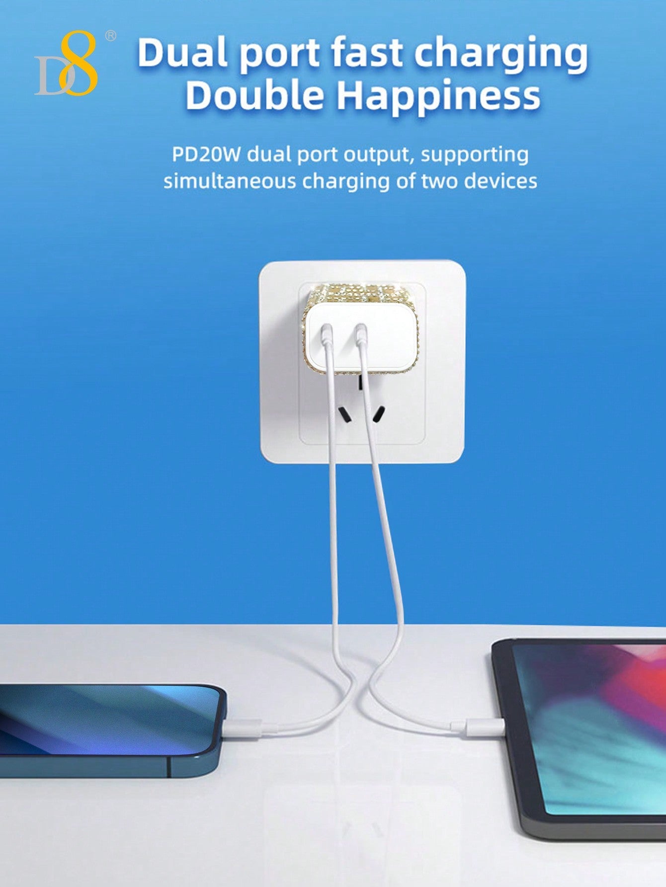 The D8 PD20W Crystal Decoration USB C Wall Charger is the ultimate fast charging solution for your devices. Featuring 20W Power Delivery, dual USB-C ports, and a unique crystal design, this charger delivers both style and efficiency. Whether you need to charge your iPhone 16, iPhone 15, or other USB-C devices, this charger provides rapid, safe, and reliable charging. Elevate your charging experience with this elegant and high-performance USB-C charger.