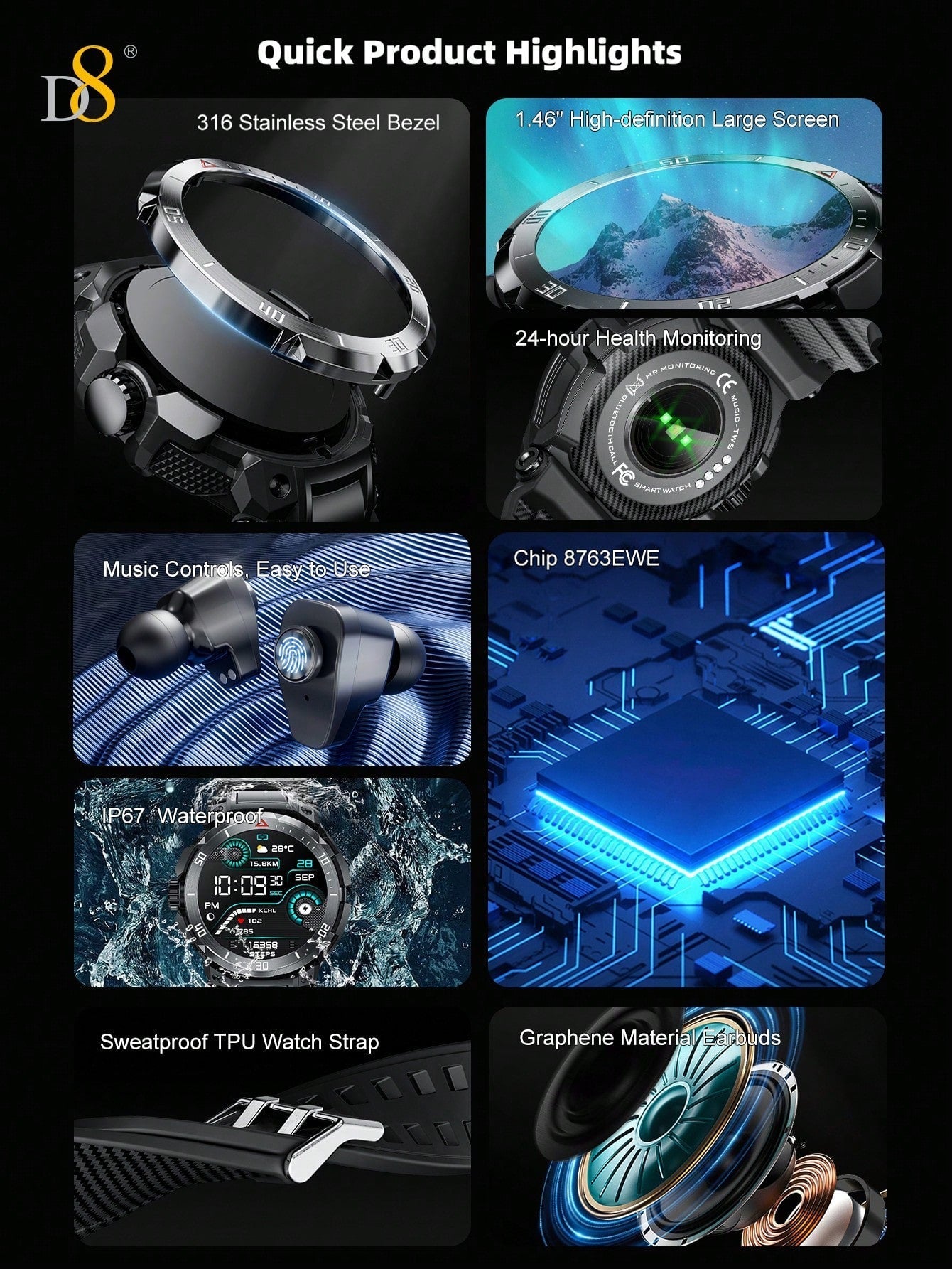 D8 Smartwatch with Earbuds, 1.46" HD, 110+ Fitness Modes, Android/iOS
