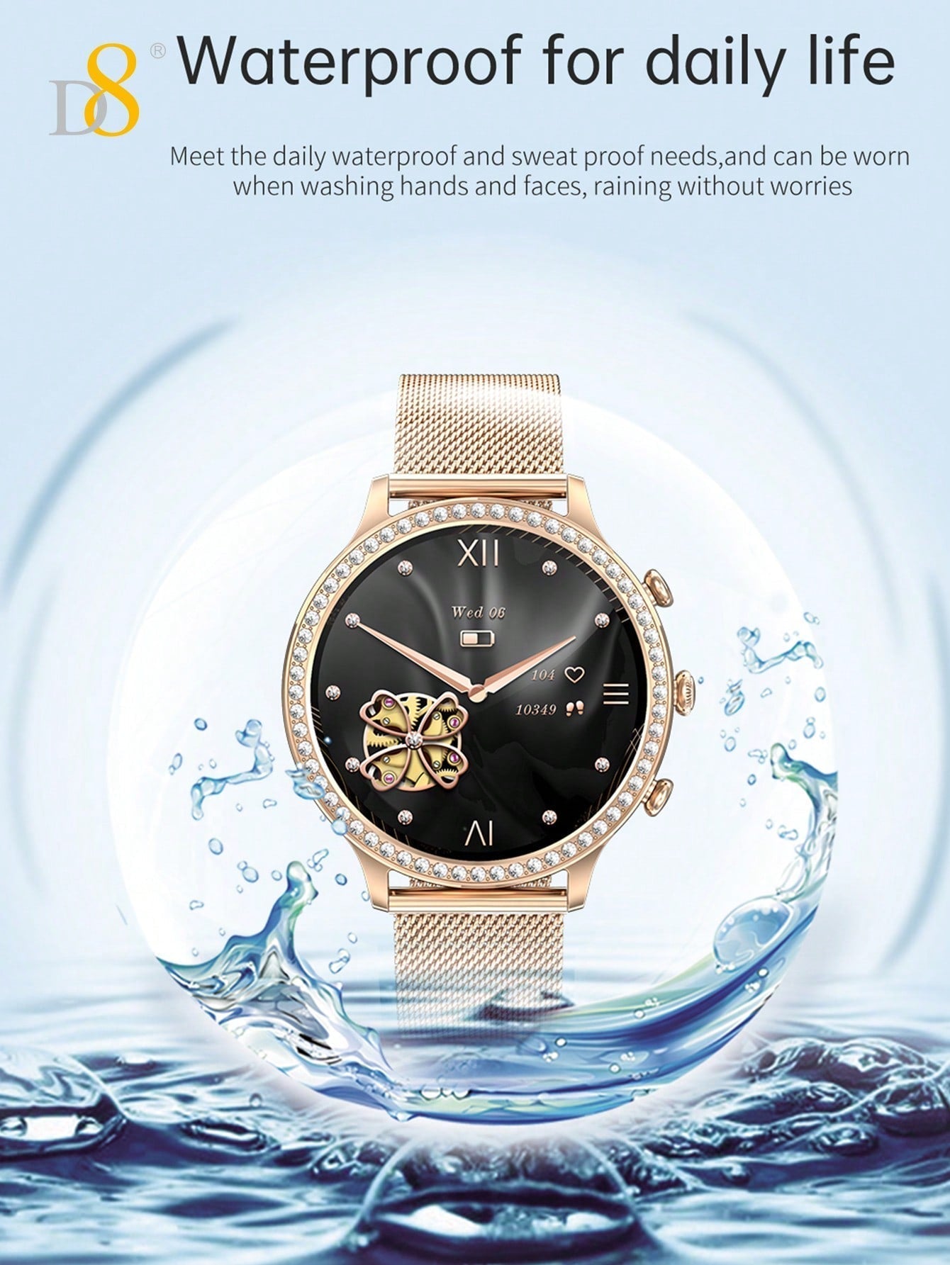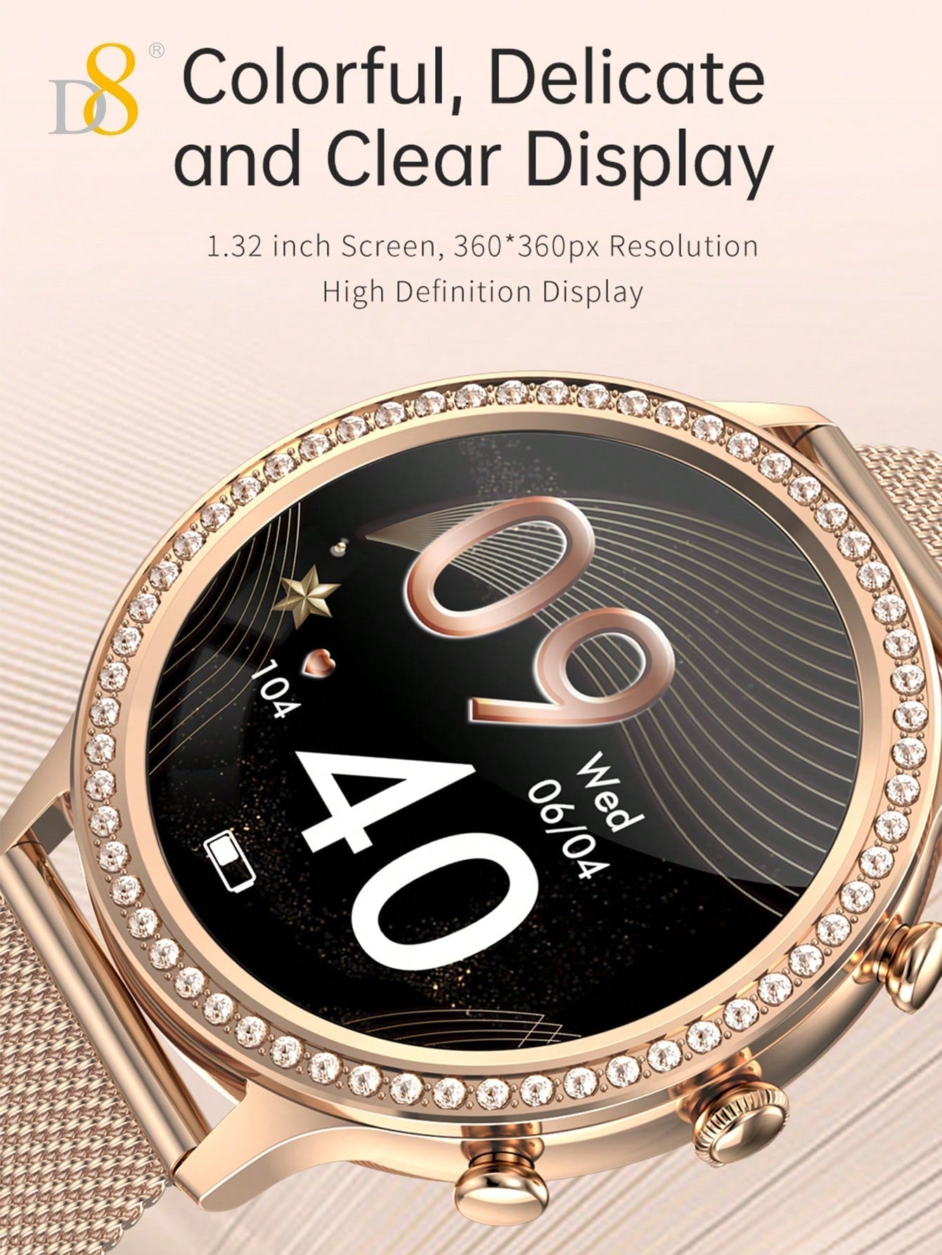 - Stylish and Functional: The D8 Smartwatch offers the best of both worlds: a luxurious design featuring a diamond-encrusted bezel, combined with powerful health and fitness features.