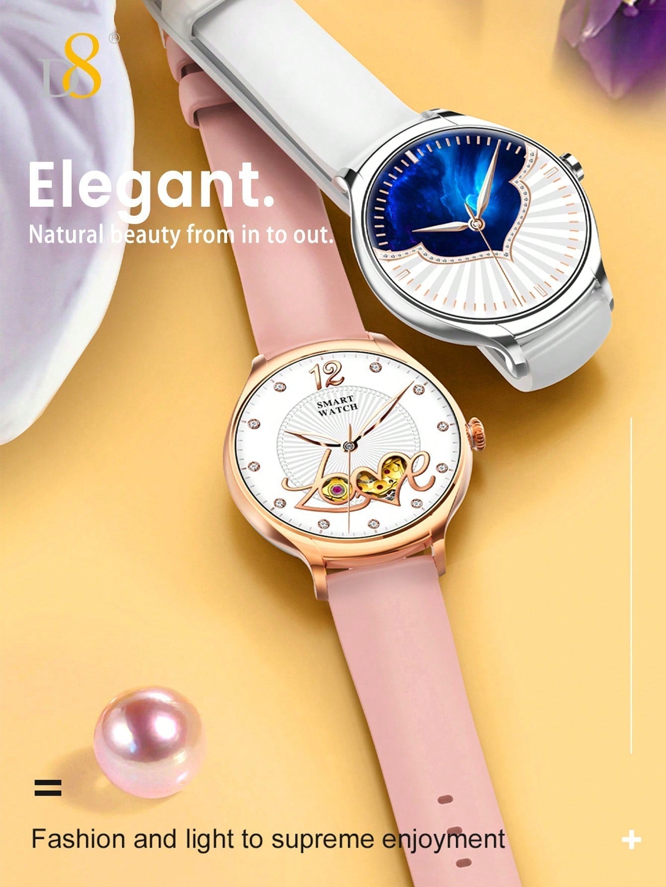 The D8 Smartwatch for Women is a beautifully designed, versatile smartwatch that combines elegance with advanced fitness tracking capabilities. With a 1.39" touchscreen and a waterproof design, this smartwatch is perfect for the modern woman who values both fashion and function. Whether you're working out, tracking your daily activity, or keeping up with notifications, the D8 smartwatch offers everything you need to stay on top of your goals. It features 100+ sports modes, a sleep monitor, pedometer, and a music player, making it the ultimate companion for your active lifestyle.