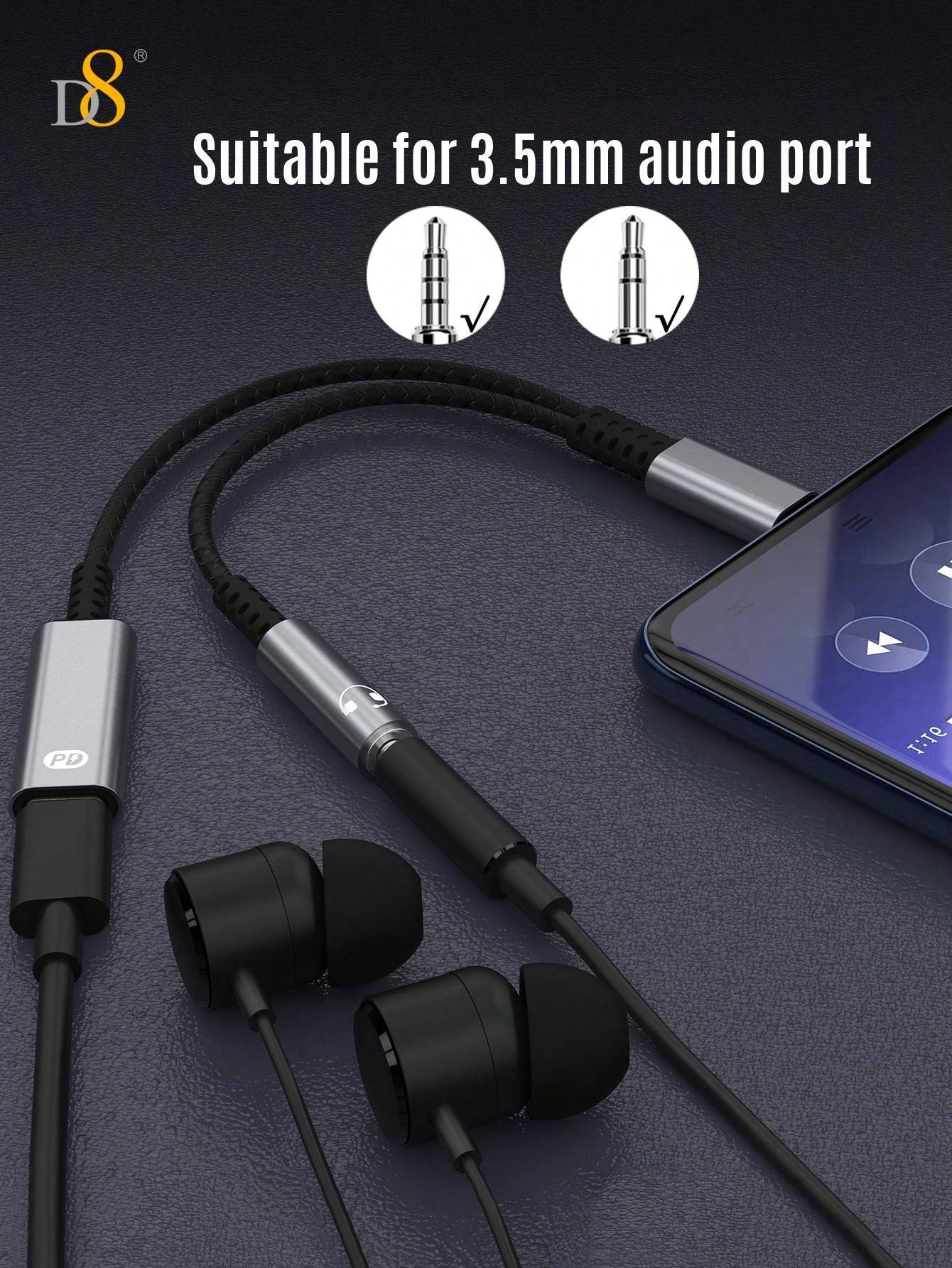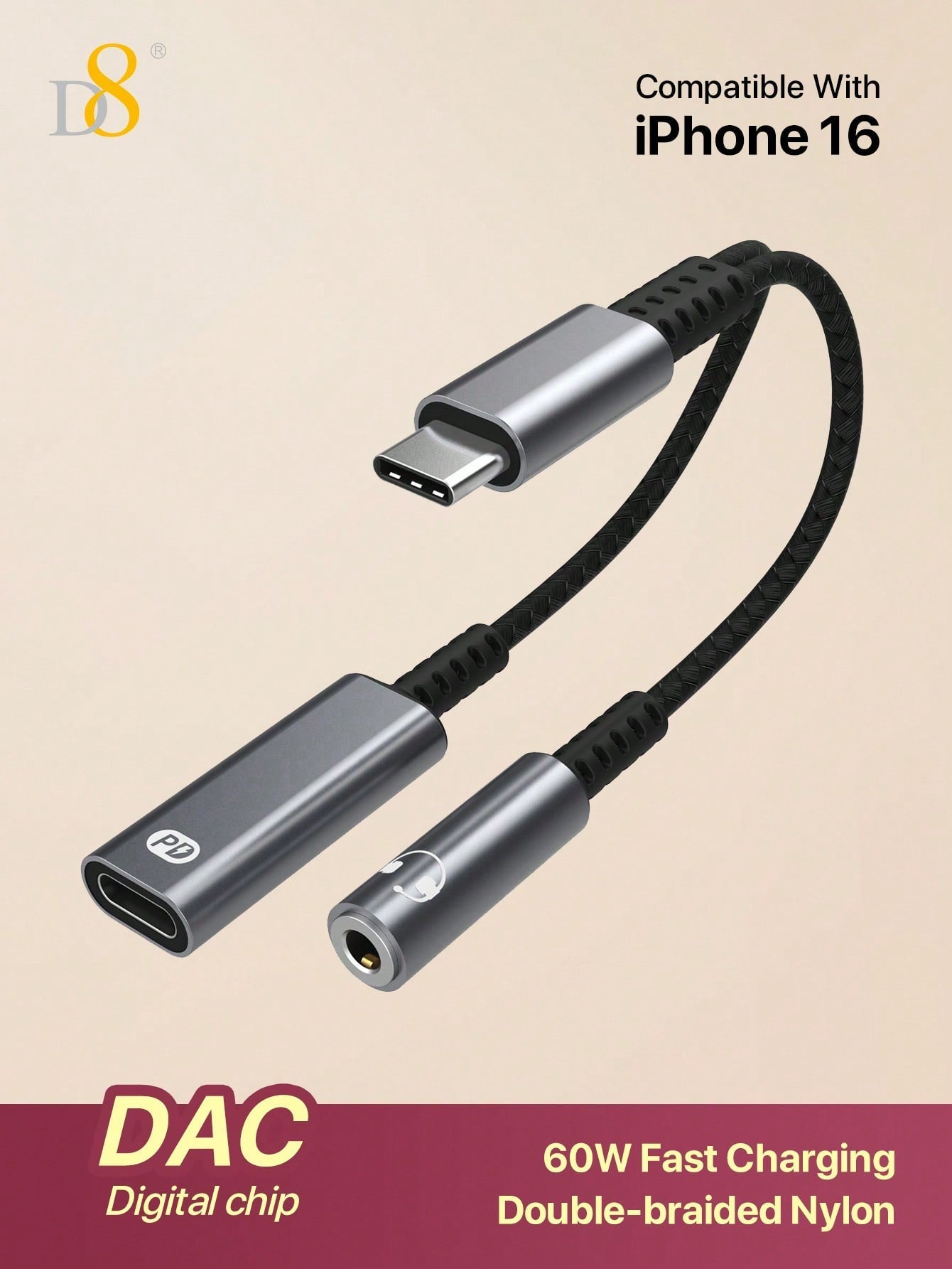 D8 USB-C to 3.5mm Adapter, 2-in-1 Audio + 60W Fast Charger for iPhone/Samsung
