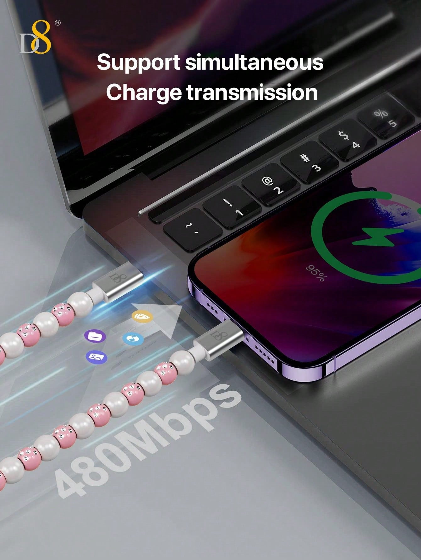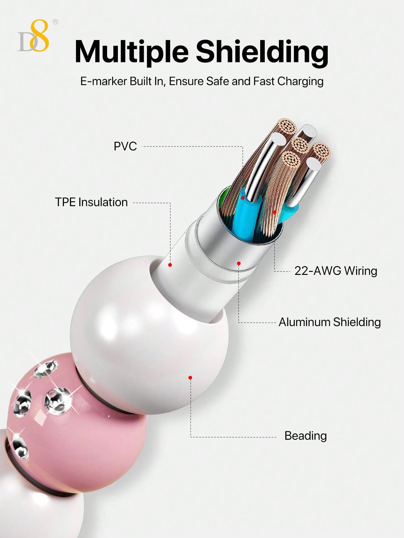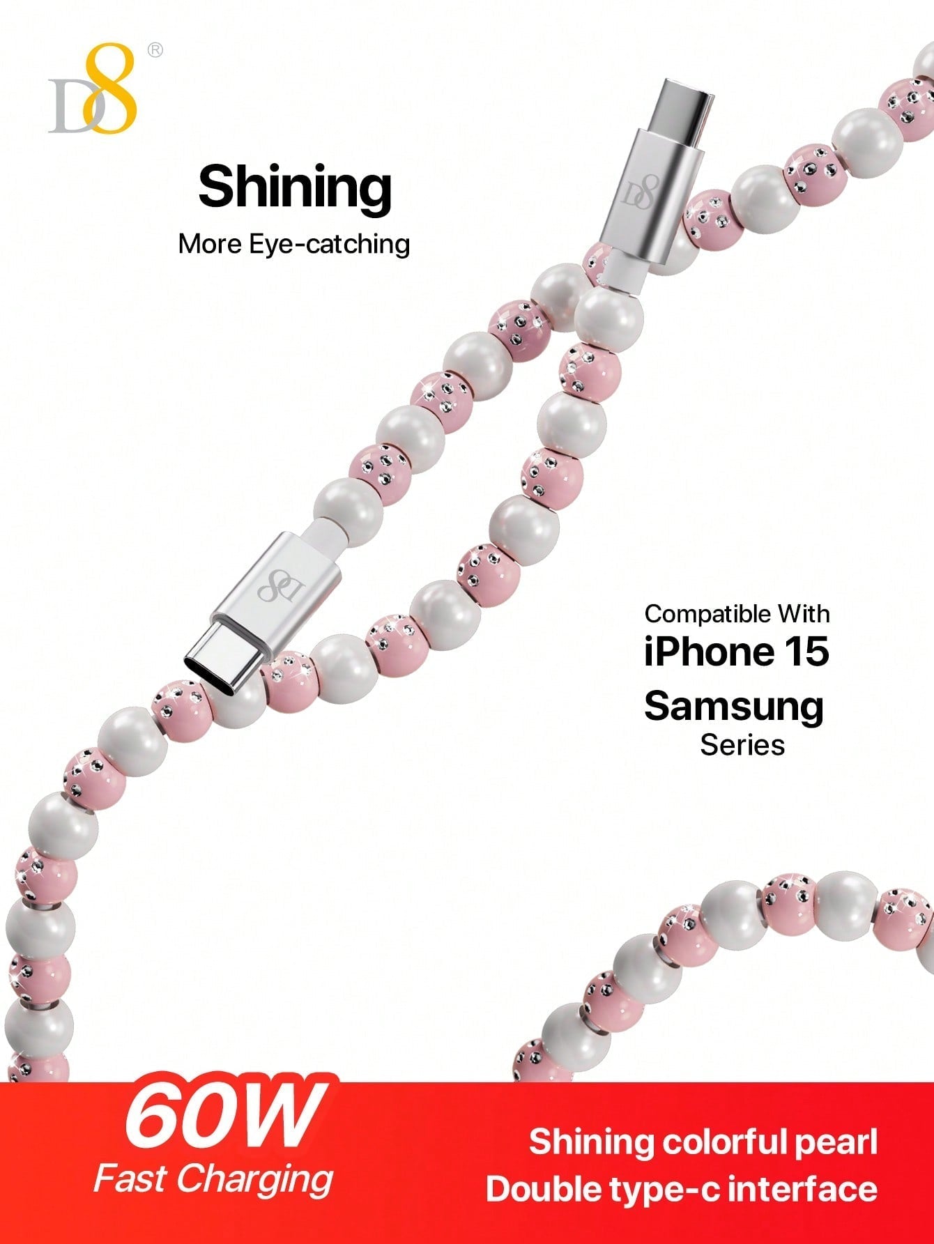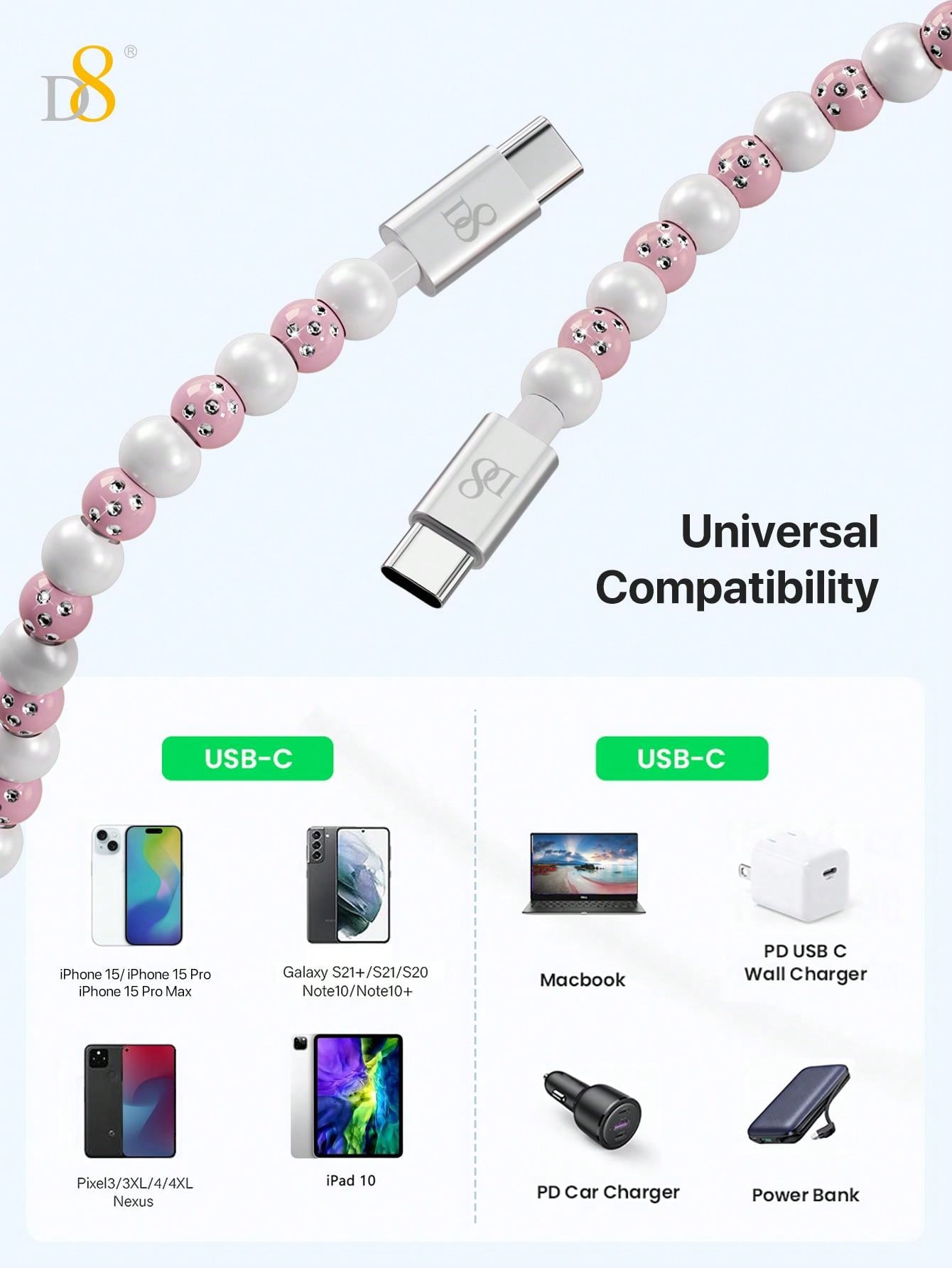 The D8 USB C to Type C Cable (3.3ft, PD 60W) is the ultimate fast charging solution for all your USB-C compatible devices. Whether you need to charge your iPhone 15 Pro Max, iPad Pro, or Samsung Galaxy, this braided beaded cable offers a fast and secure connection. With PD 60W power delivery, it ensures efficient charging for phones, tablets, laptops, and other devices. The 3.3ft length provides the perfect balance of reach and convenience, making it ideal for home, office, or on-the-go use.