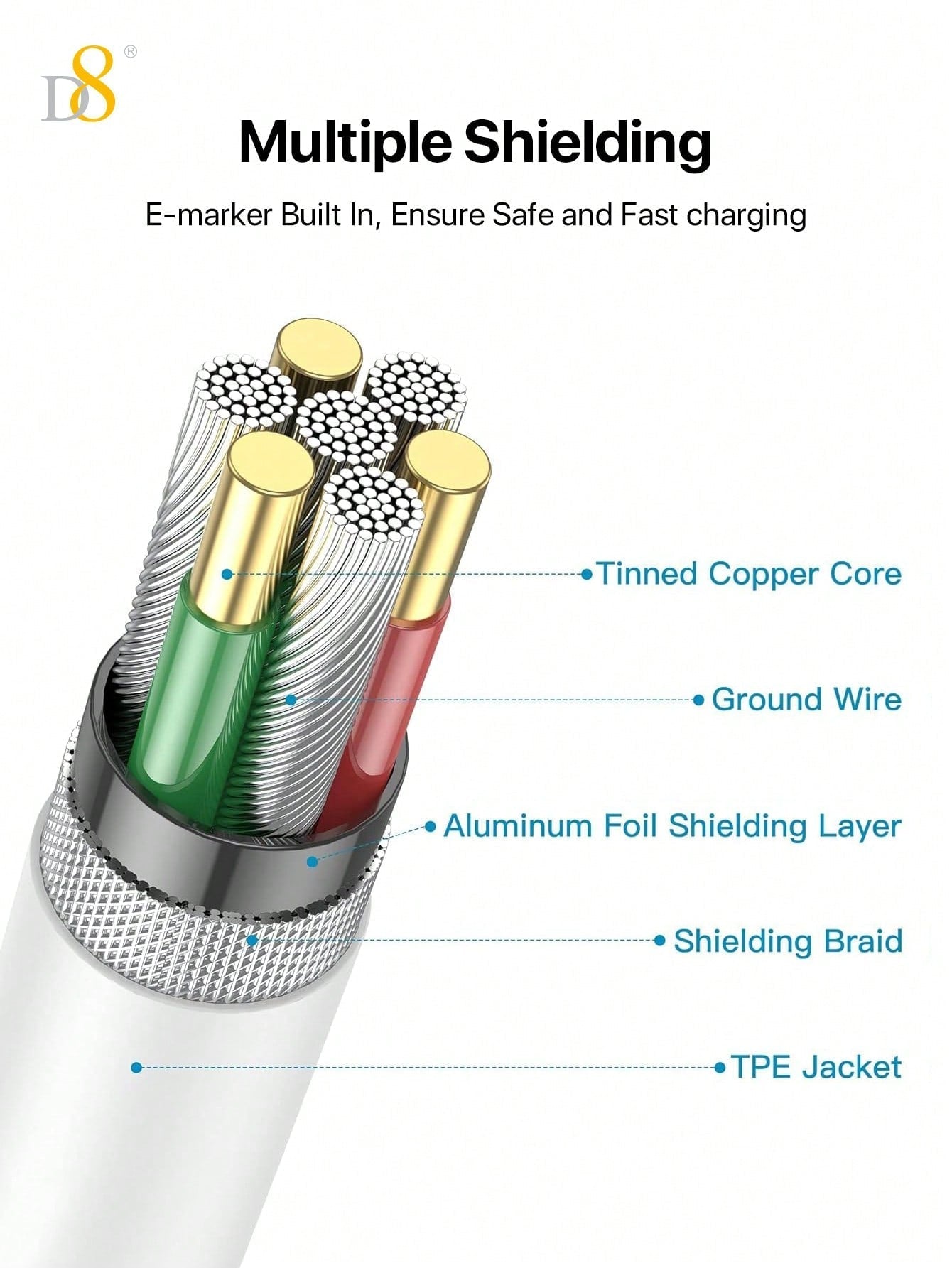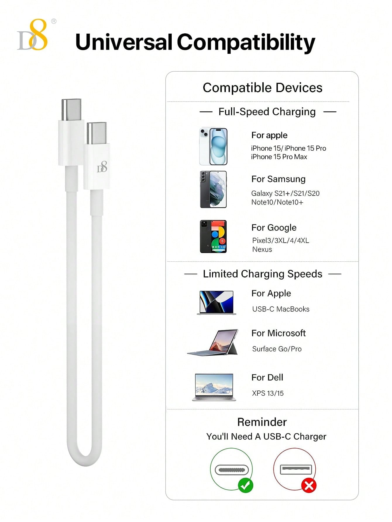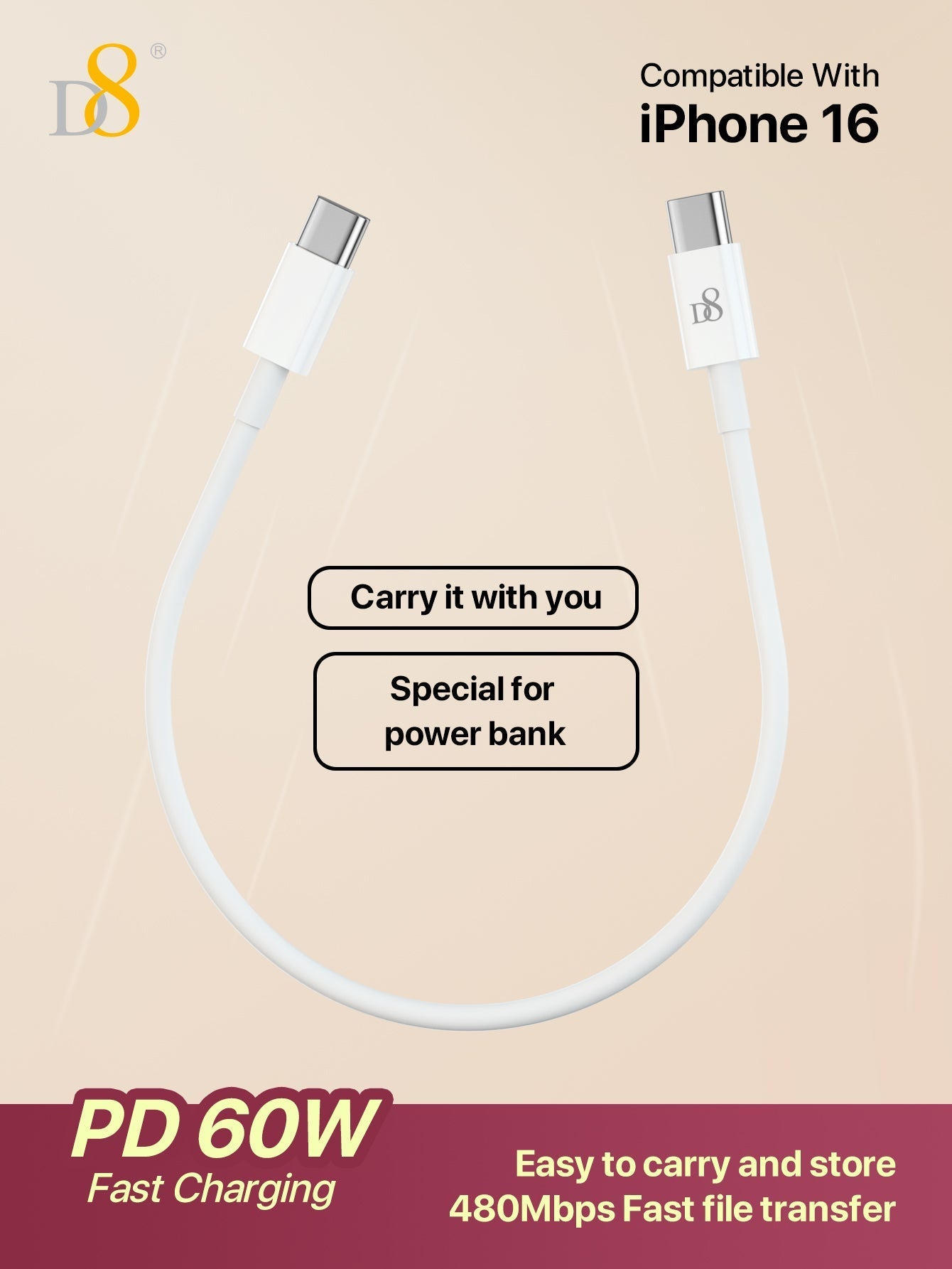 The D8 USB C to USB C Cable (0.83ft, 60W/3A) is an excellent choice for those looking for a reliable, fast, and durable cable for iPhone, iPad, and Samsung Galaxy devices. With fast charging capabilities, a TPE durable construction, and compact portability, this cable is a perfect addition to your phone accessories. Whether you're charging at home, in the car, or on the go, this short USB C charger cable will keep your devices powered and ready to go.