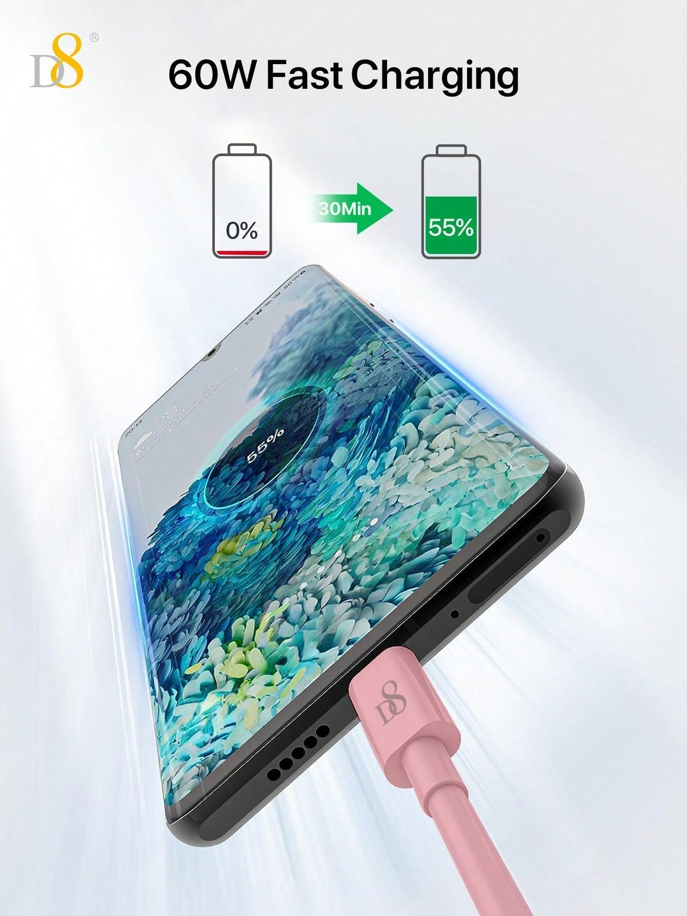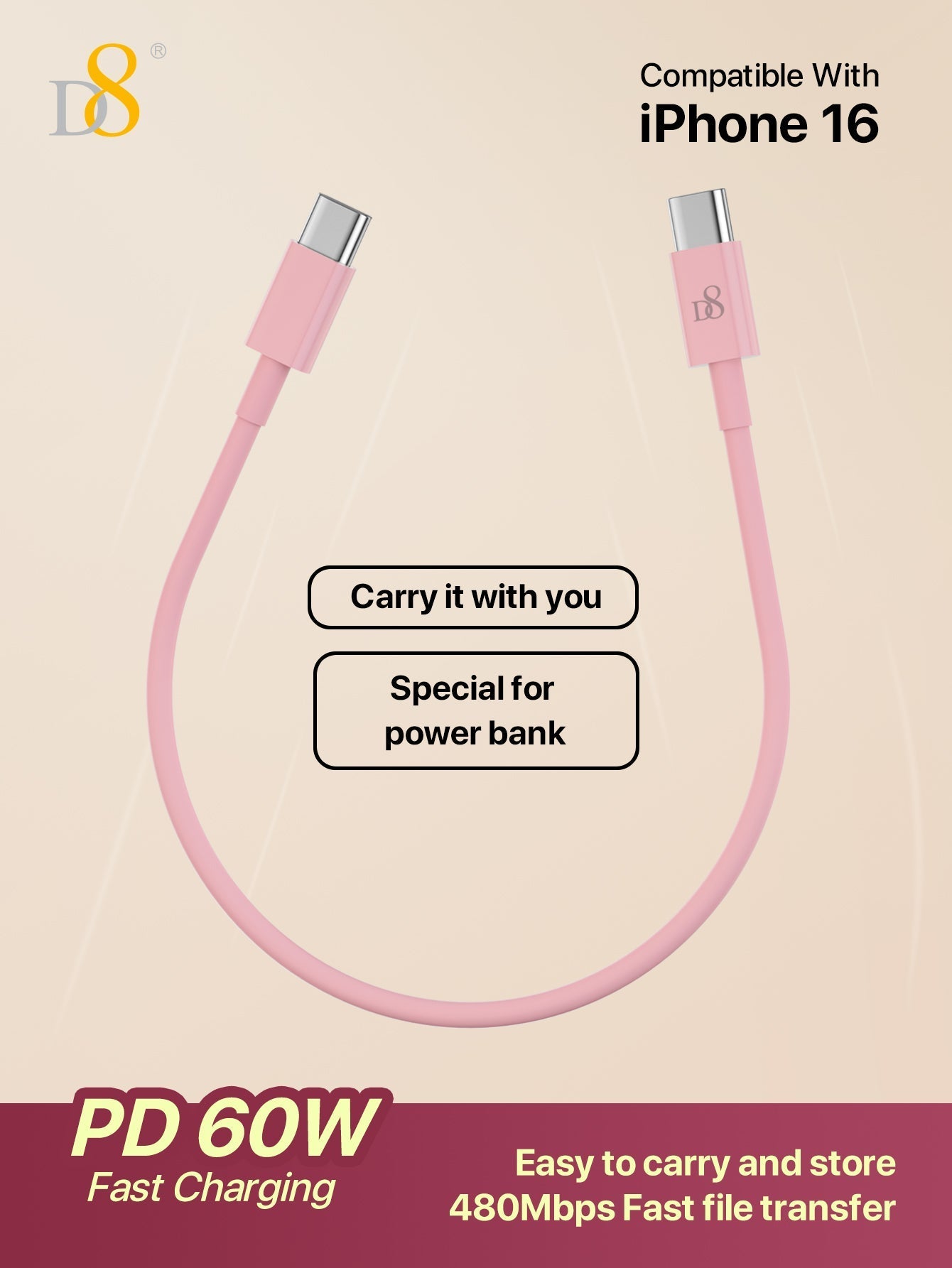 The D8 USB C to USB C Cable (0.83ft) is a premium fast-charging solution designed to meet the needs of modern devices. Whether you're charging your iPhone 16, iPad Pro, or Samsung Galaxy S23, this Type C charging cable offers 60W power delivery for lightning-fast charging. The 0.83ft (25cm) length provides the perfect balance between portability and functionality, making it ideal for compact spaces, travel, or everyday use.