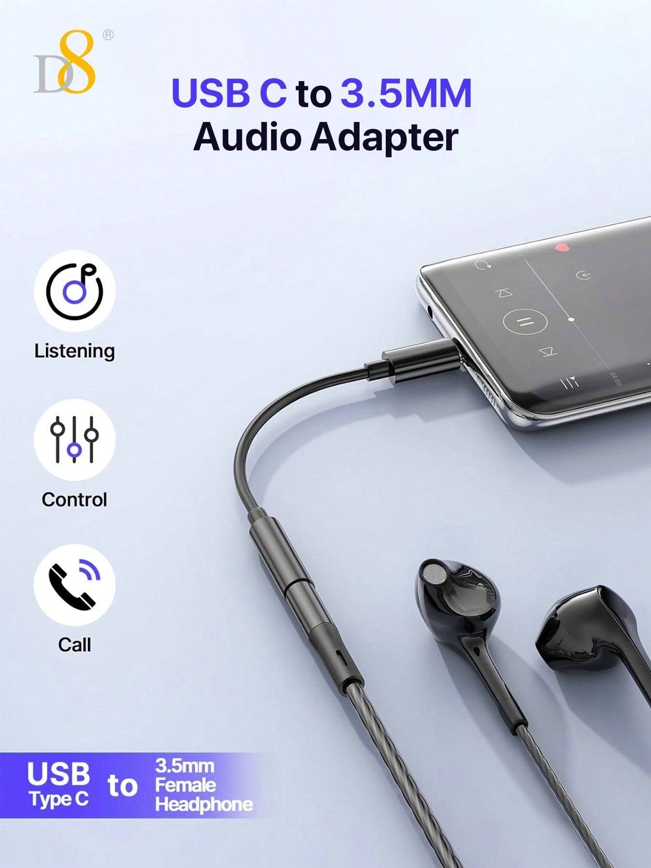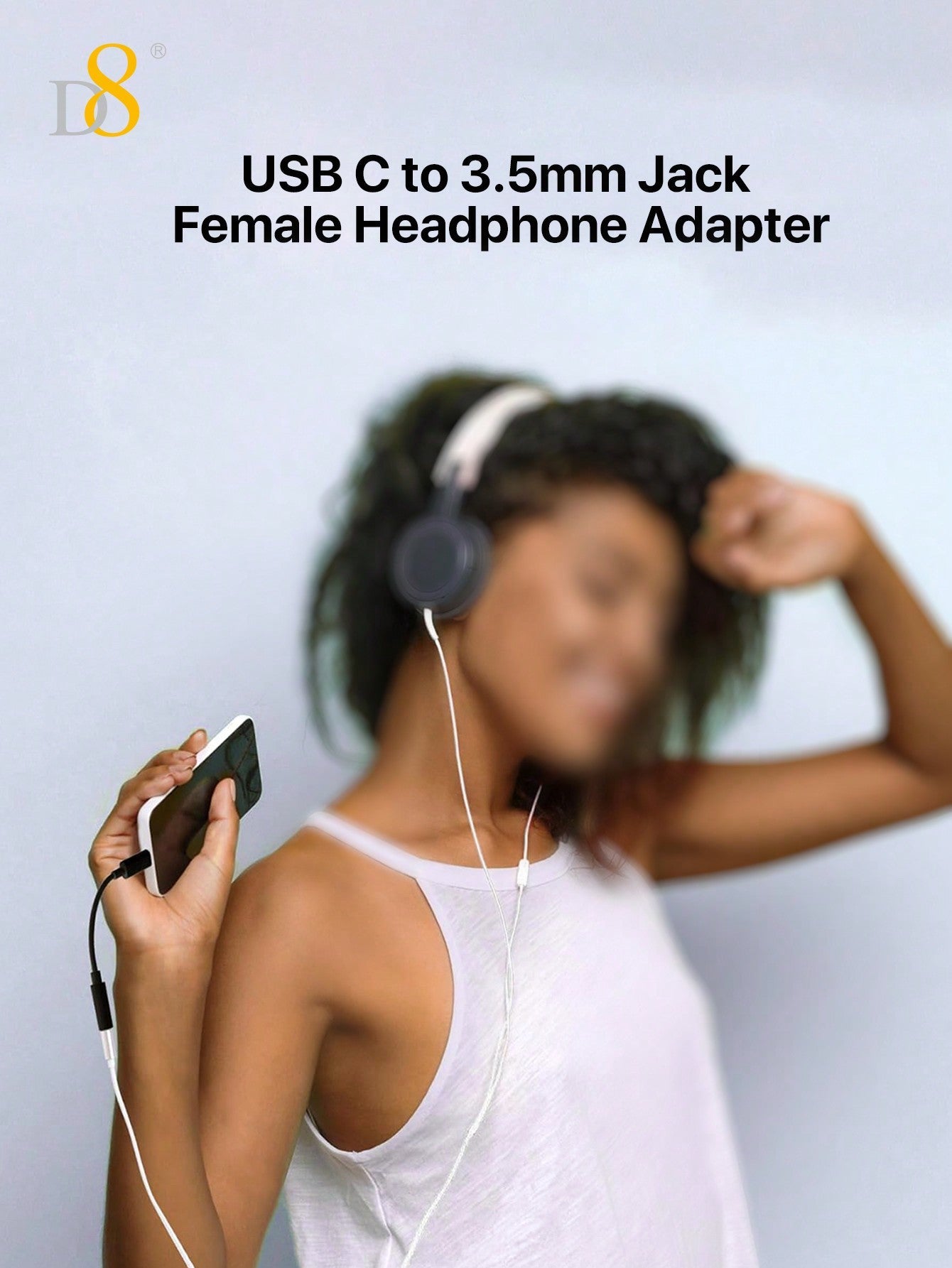 The D8 USB Type C to 3.5mm Female Headphone Jack Adapter is a compact and versatile accessory that allows you to connect your 3.5mm headphones, earphones, or speakers to devices with USB Type C ports. This USB C to Aux Audio Dongle ensures high-quality sound for music, podcasts, calls, and more, making it perfect for the latest iPhone 16, iPhone 15 Pro, Samsung Galaxy S24, Google Pixel 8, and other Type C-enabled devices. Enjoy clear, crisp audio and the convenience of using your favorite headphones or earphones without worrying about compatibility issues.