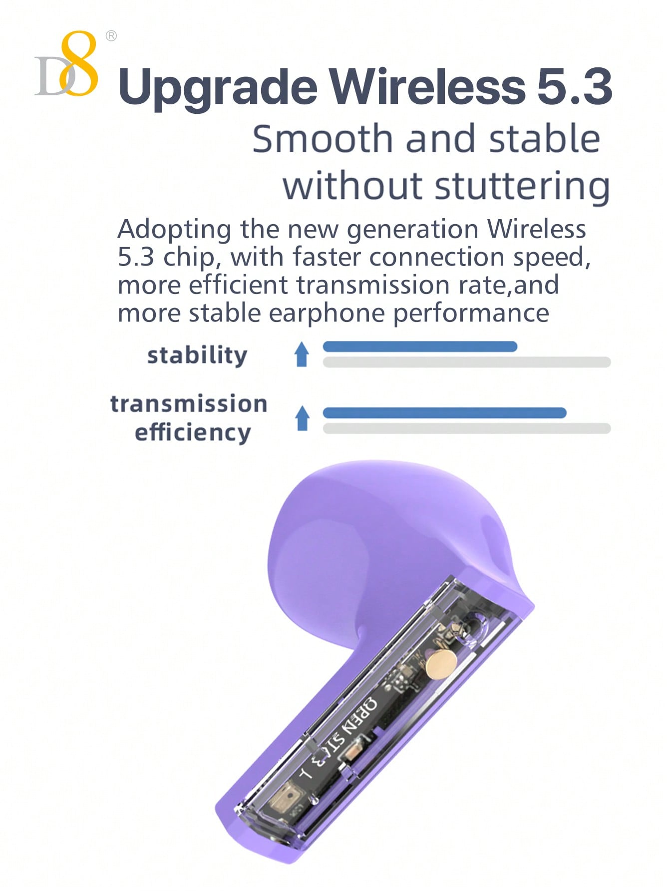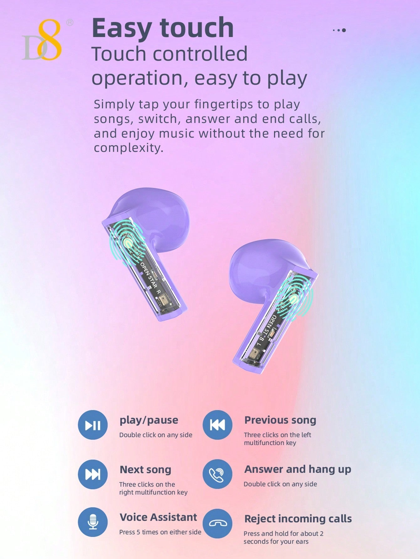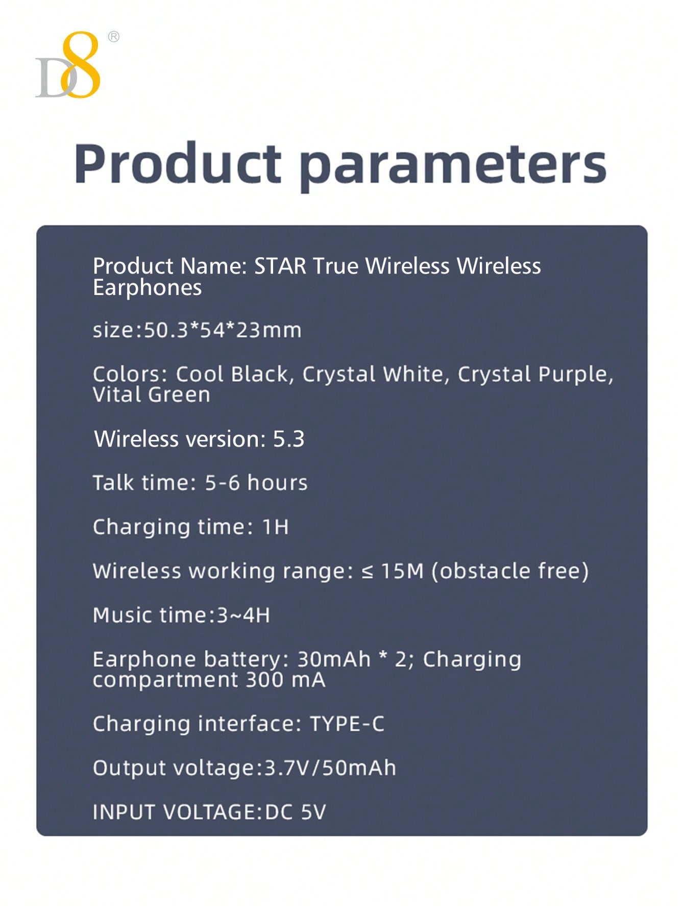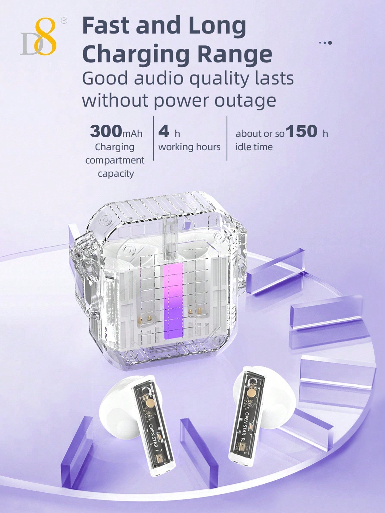 The D8 Wireless Earbuds combine cutting-edge features, such as IPX5 waterproofing, RGB light effects, and near CD-level sound quality, to deliver an exceptional listening experience. With a long-distance connection, built-in microphone, and a convenient charging case, these earbuds are perfect for active individuals, music lovers, and tech enthusiasts. Whether you're working out, gaming, or simply enjoying your favorite songs, the D8 Wireless Earbuds provide a stylish, durable, and high-performance solution for all your audio needs.