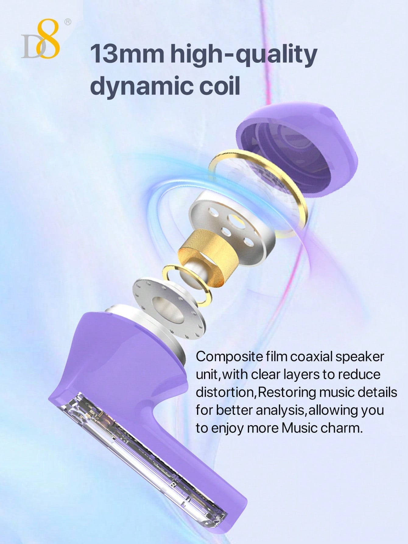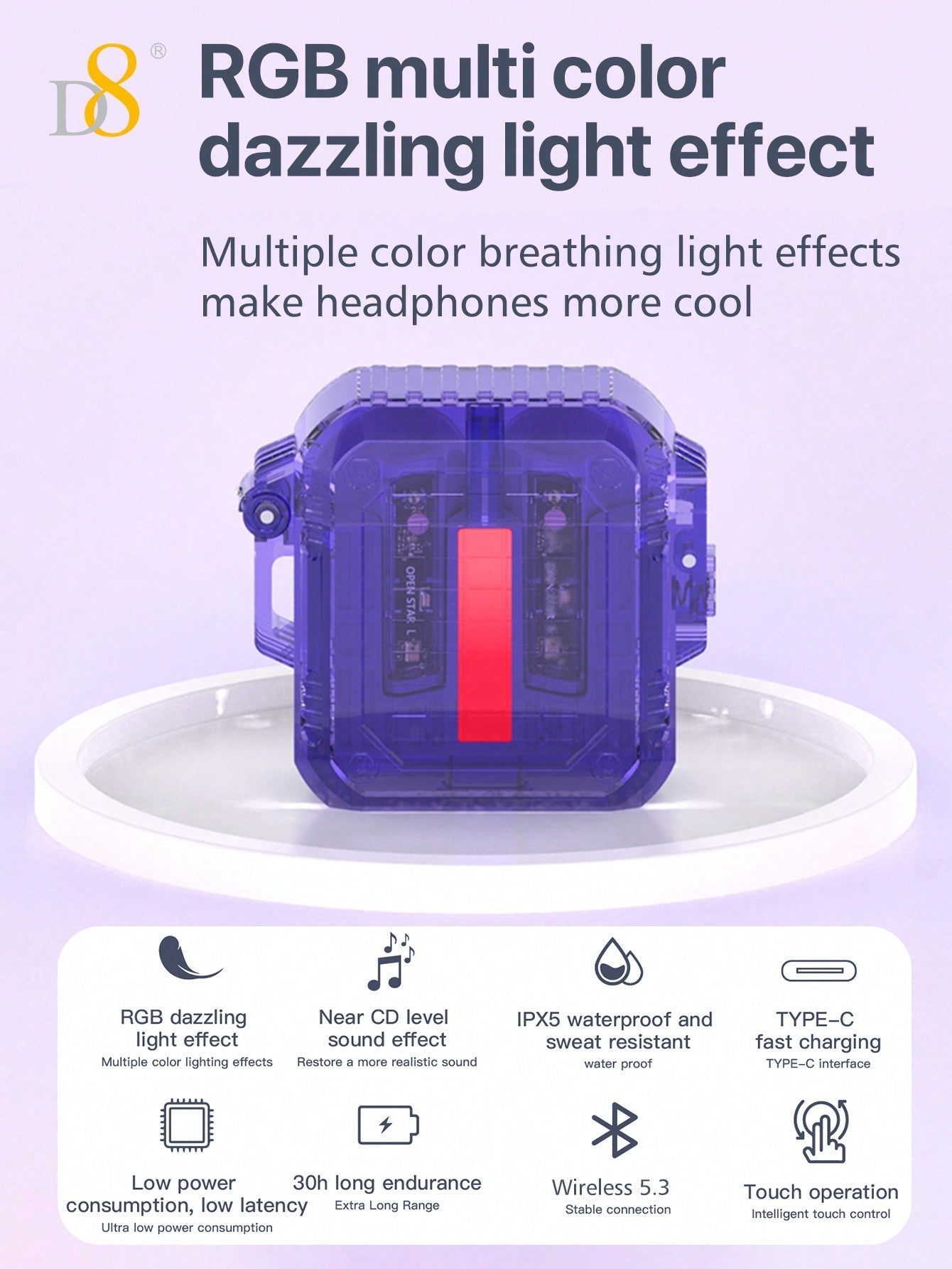 D8 Wireless Earbuds, Lightweight, Mic, IPX5, RGB Lights, HiFi Sound, Long Range