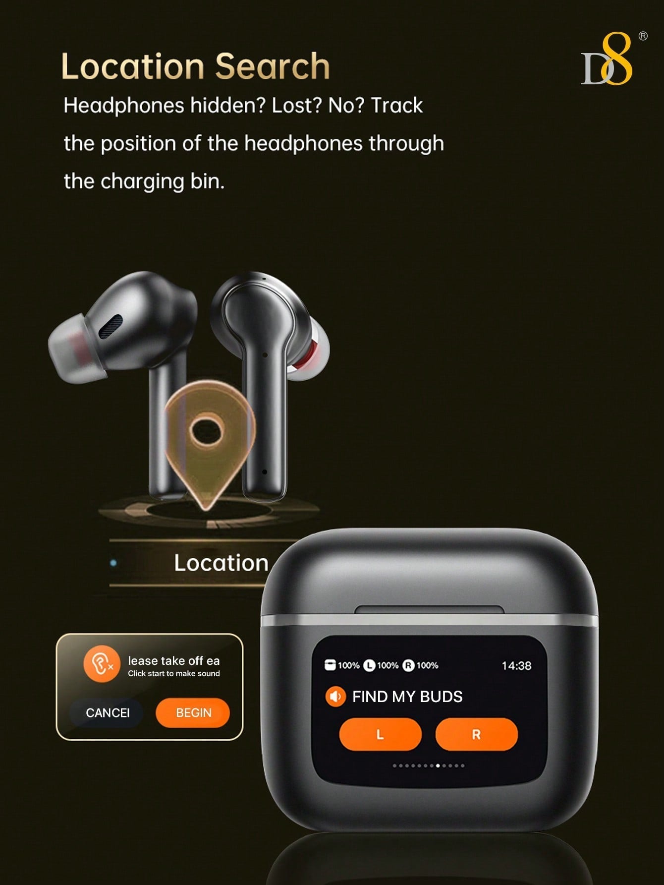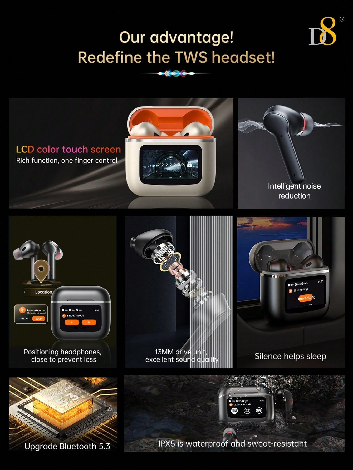 The D8 Wireless Earbuds are the ultimate combination of performance and convenience, featuring Active Noise Cancelling (ANC) technology, Transparency Mode, HIFI stereo sound, and 40 hours of playtime. Whether you're traveling, working, exercising, or just enjoying your favorite music, these Bluetooth earbuds offer a superior audio experience, complete with the latest BT 5.3 technology and an LCD smart touch screen for easy control. Compatible with iOS and Android, they provide seamless connectivity for all your audio needs.