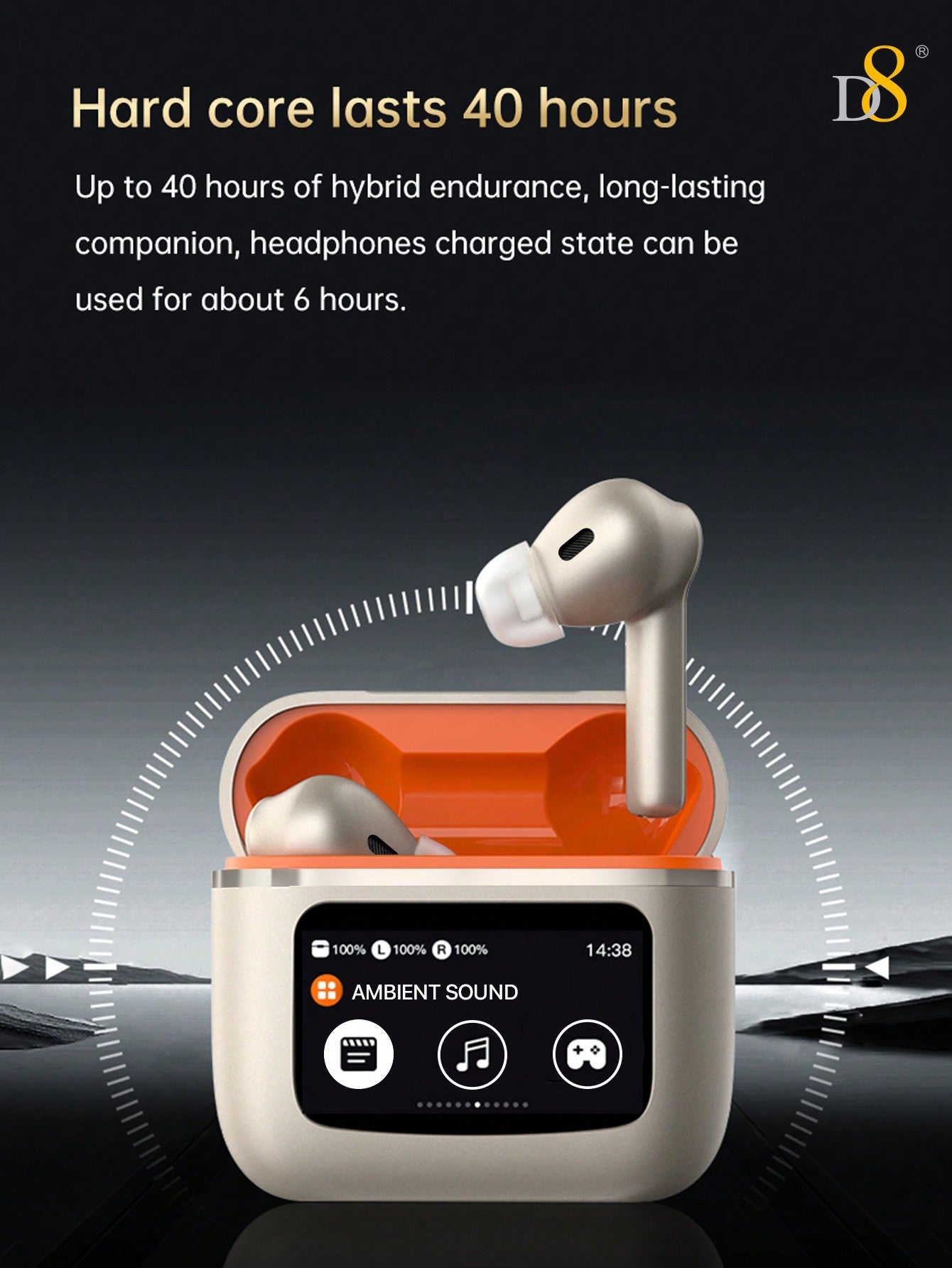 Elevate your listening experience with the D8 Wireless Earbuds. These state-of-the-art Bluetooth headphones feature Active Noise Cancelling (ANC) technology and a Transparency Mode, making them perfect for both immersive audio and staying aware of your surroundings. Equipped with an LCD smart touch screen, you have intuitive control at your fingertips. With BT 5.3 technology, the D8 Wireless Earbuds offer seamless and stable connectivity, providing up to 40 hours of playtime. Whether you're on your morning commute, working out, or relaxing at home, these HIFI stereo sound earbuds deliver high-quality audio, compatible with IOS and Android devices.