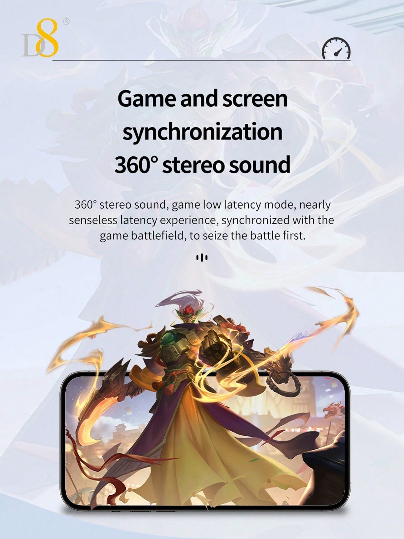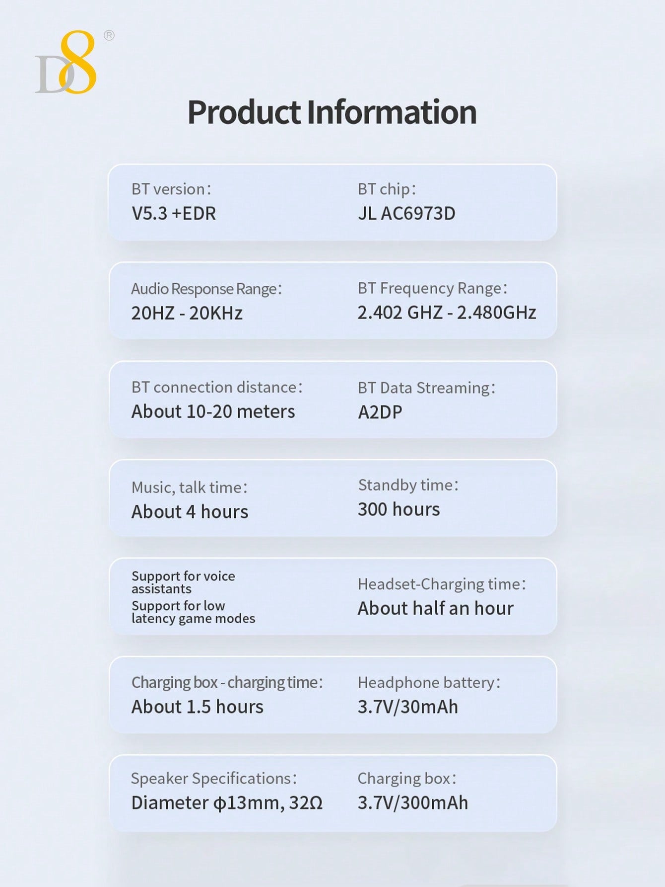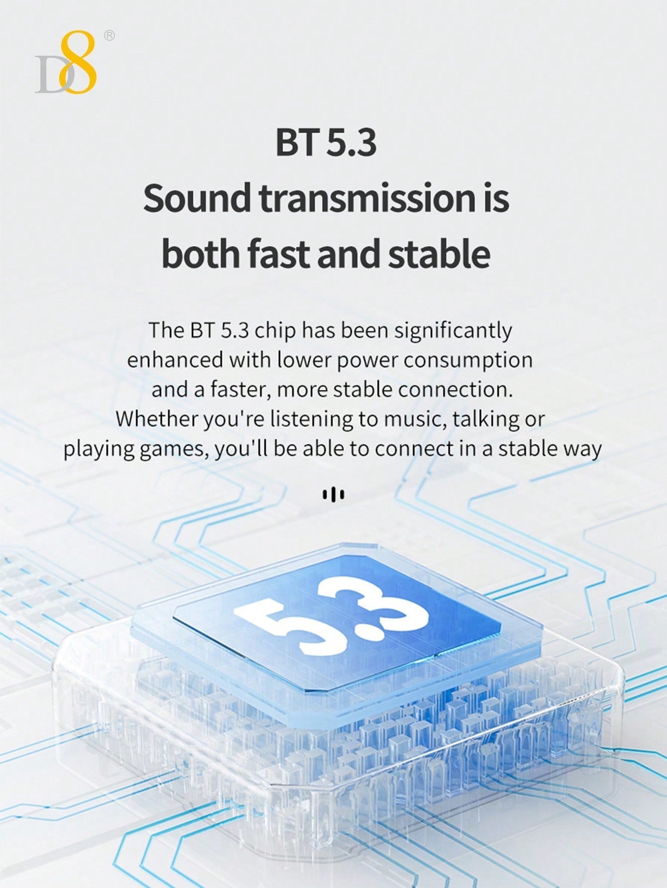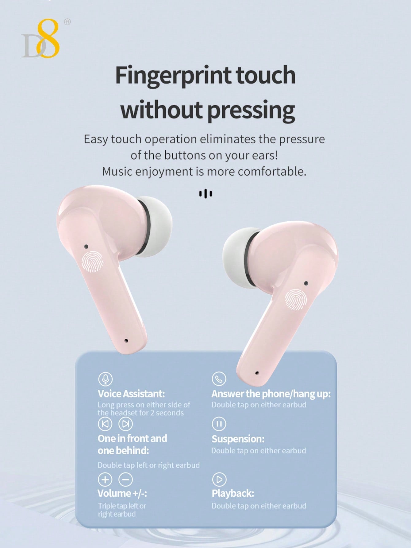 The D8 Wireless Earbuds offer an unbeatable combination of high-quality sound, long-lasting battery, and clear call quality. With Stereo Bass, 13mm drivers, 5.3 Bluetooth connectivity, and a convenient USB-C charging case, these earbuds are perfect for music lovers, sports enthusiasts, and anyone who needs a reliable audio solution on the go. Whether you're listening to music, making calls, or working out, the D8 Wireless Earbuds provide a premium, comfortable, and long-lasting audio experience.