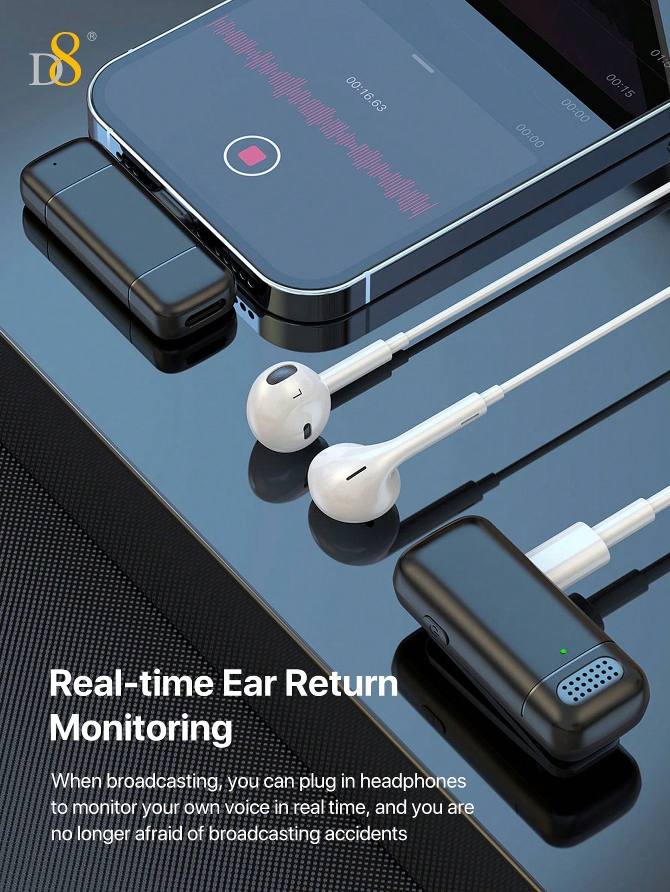 Simply clip the D8 Wireless Lavalier Microphone onto your clothing, connect it to your USB-C-enabled device, and start recording. The real-time auto-sync feature ensures smooth audio capture with minimal latency, making it ideal for live streaming, vlogs, interviews, and professional recordings. When not in use, place the microphone back into its charging case to keep it powered and ready for the next session.