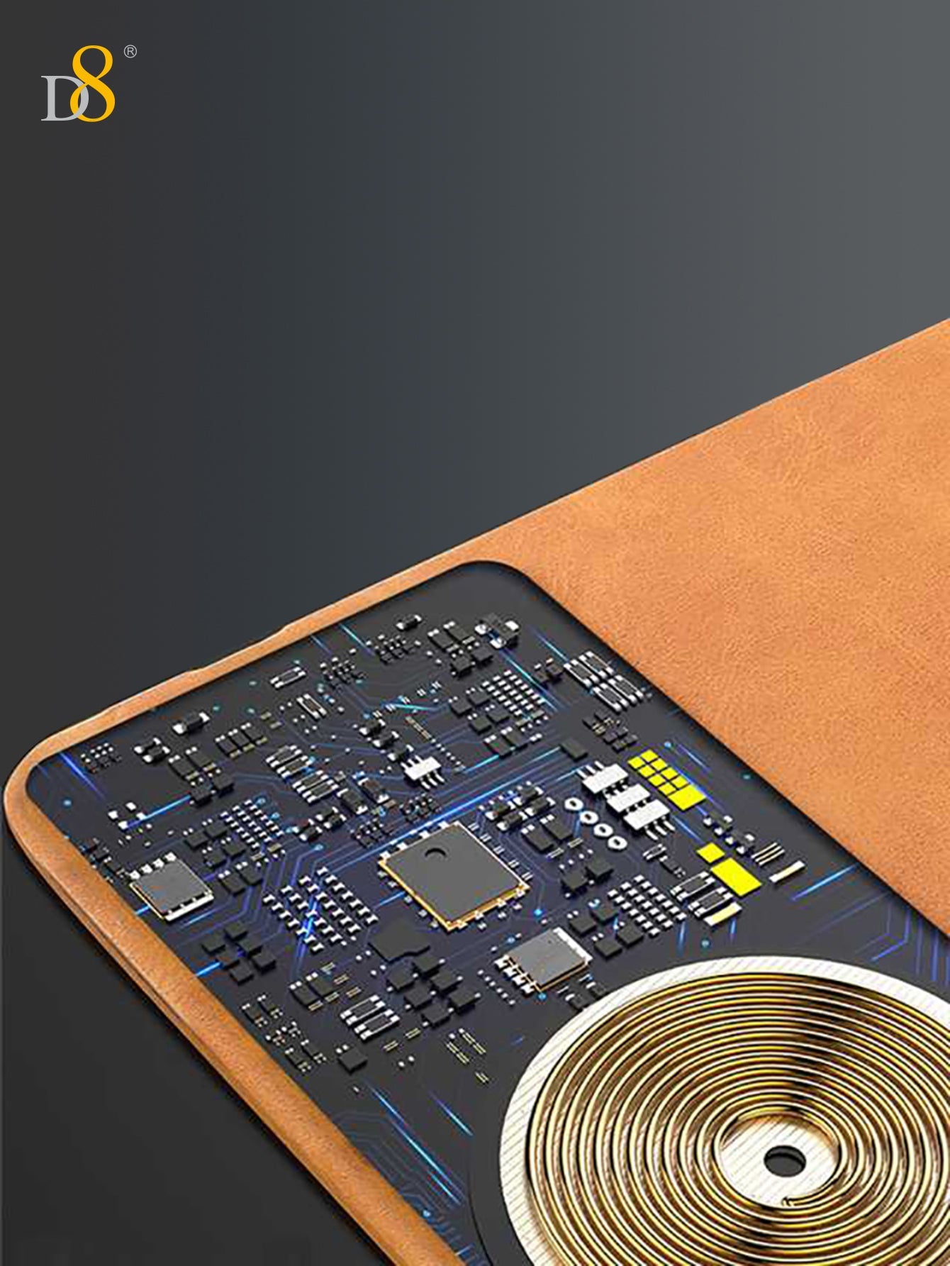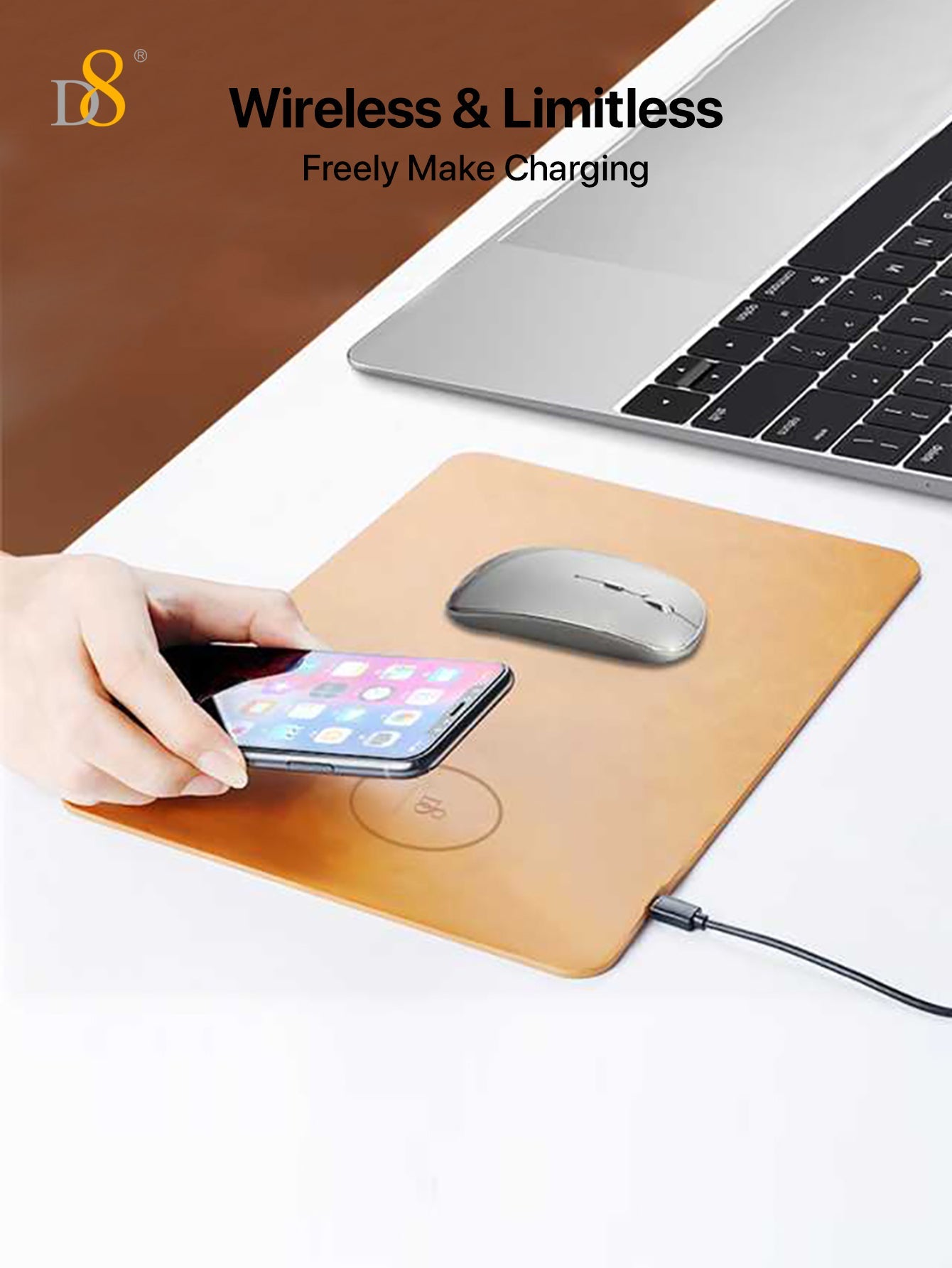 Elevate your workspace with the Dynamic8 Wireless Charger Mouse Pad, a fusion of practicality and elegance. Crafted from premium PU/genuine leather, this mouse pad not only enhances your desk aesthetics but also offers seamless wireless charging capabilities.