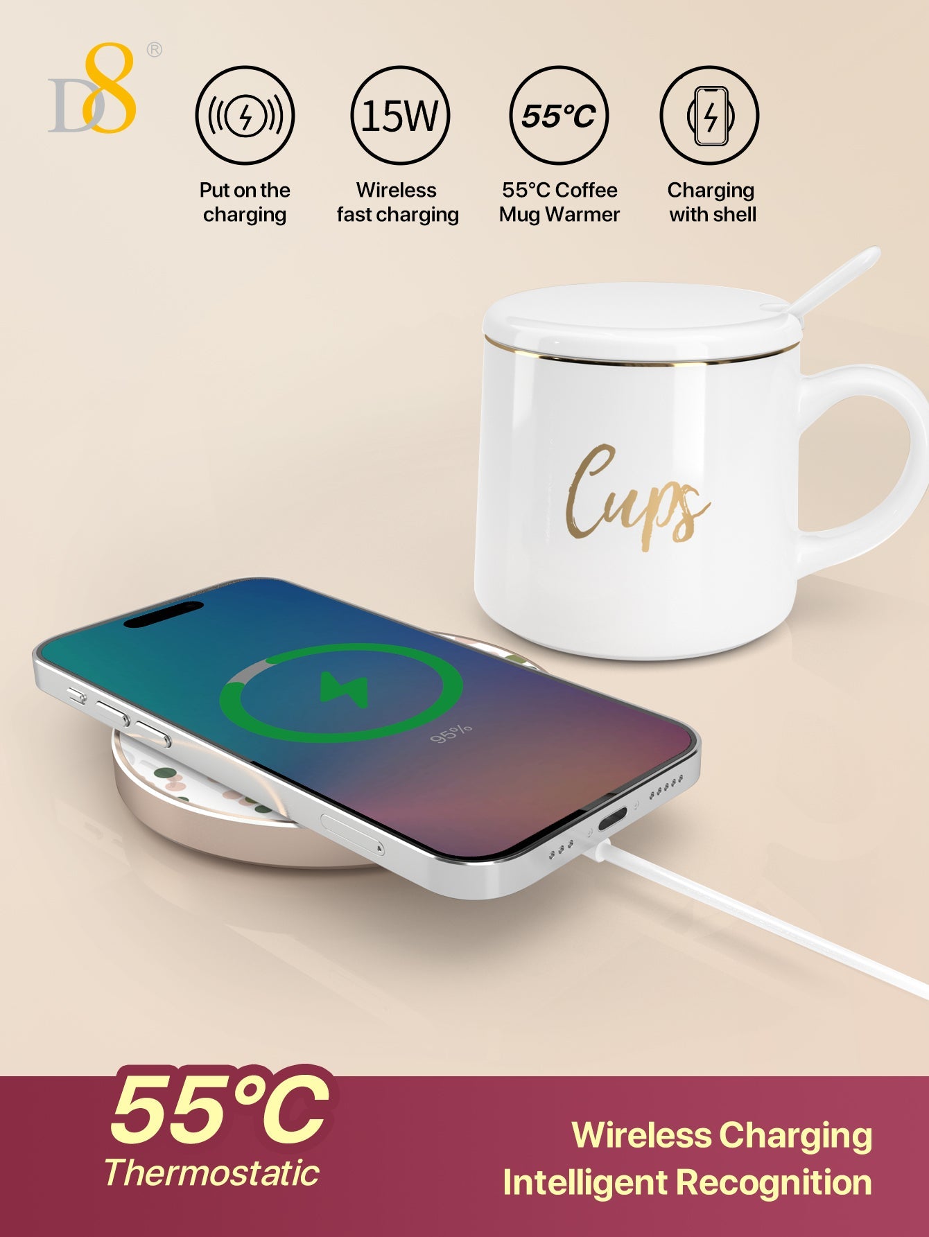 - Dual Functionality: Acts as both a 55℃ thermostatic mug and a powerful wireless charger (15W/10W/7.5W/5W) for smartphones.