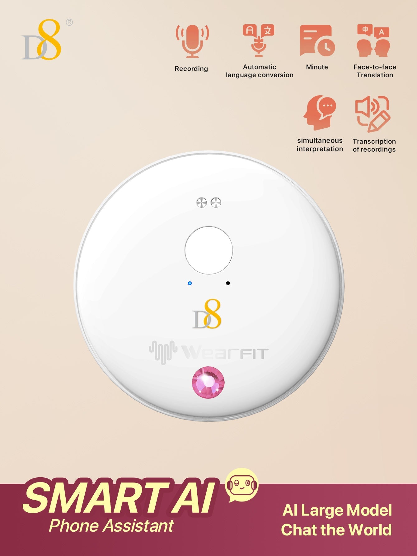 Break language barriers effortlessly with the D8 AI Translator Recorder, your ultimate companion for global communication. Powered by an advanced AI large model, this device offers real-time translation, transcription, and intelligent analysis in 50+ languages—perfect for business meetings, international travel, or study abroad. With zero subscription fees and app-controlled precision, it’s your passport to seamless, worry-free conversations.