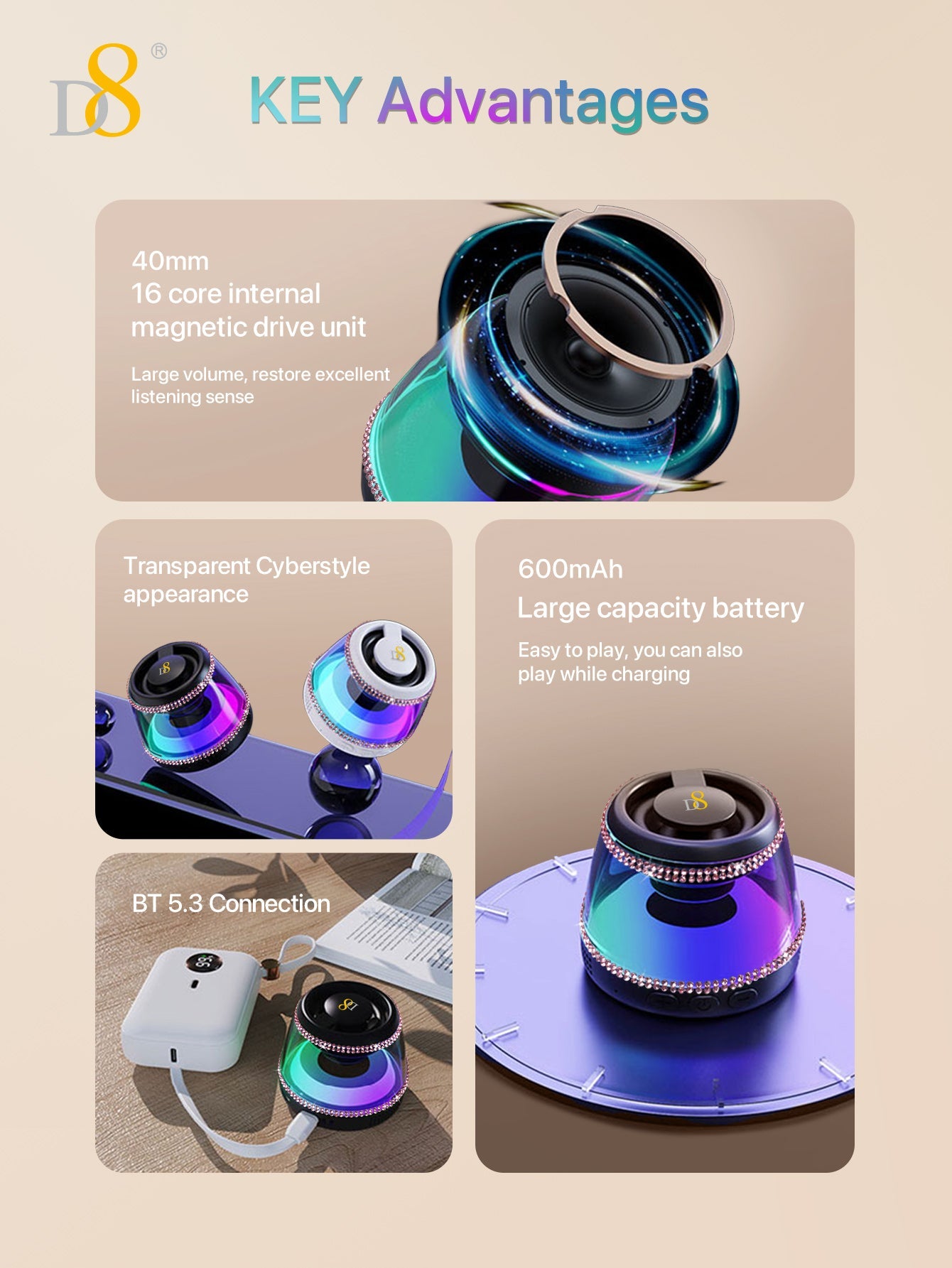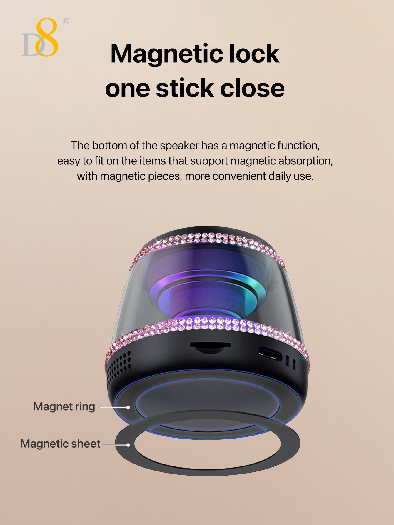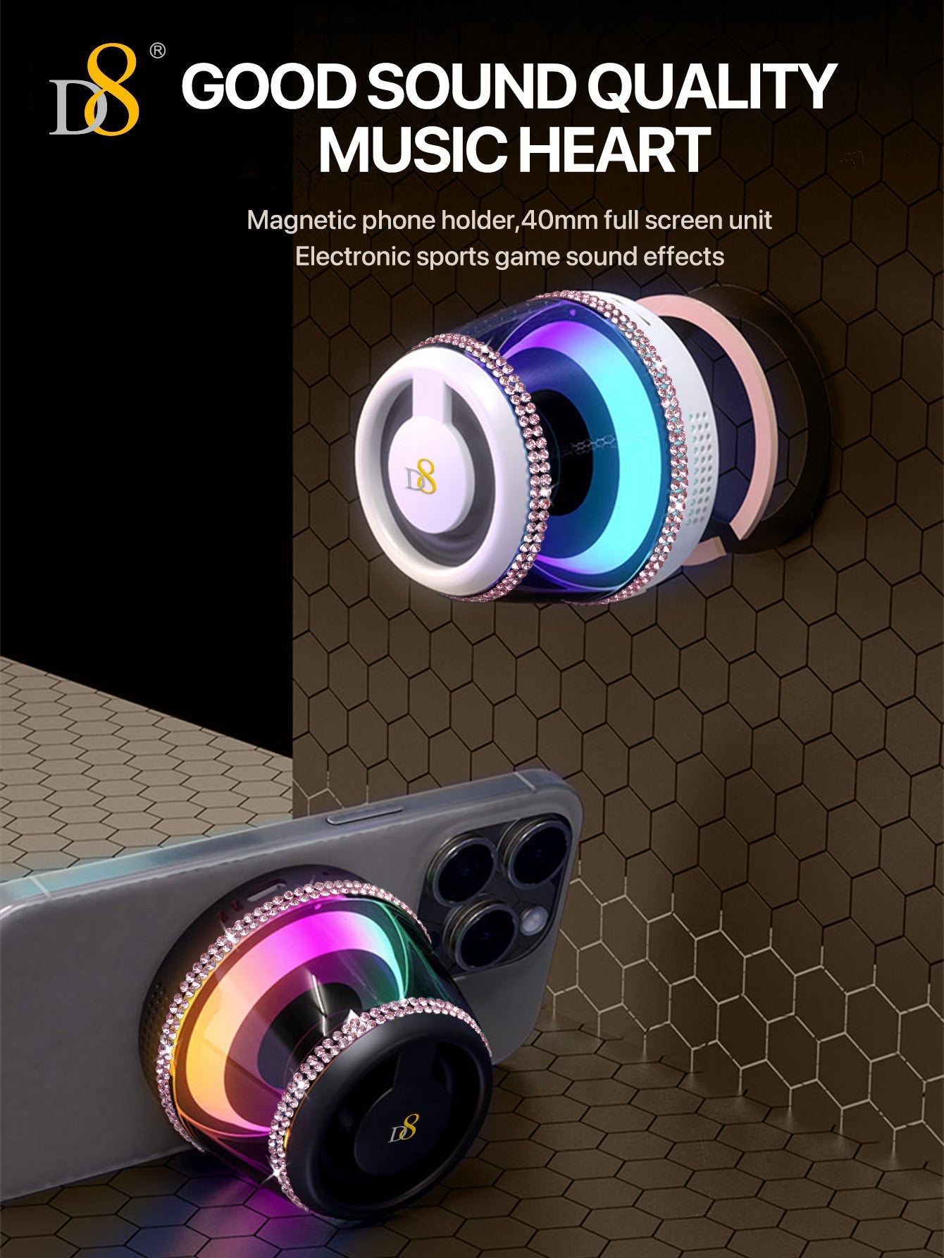 D8 Wireless Induction Magnetic Bluetooth Speaker, Portable Mini Bluetooth Loudspeaker with Bass Diaphragm, 5W Internal-Magnet, 10H Playtime, RGB Light, Including Magnetic Ring and Lanyard, Silicone folding air cabinInnovative folding airbag structure